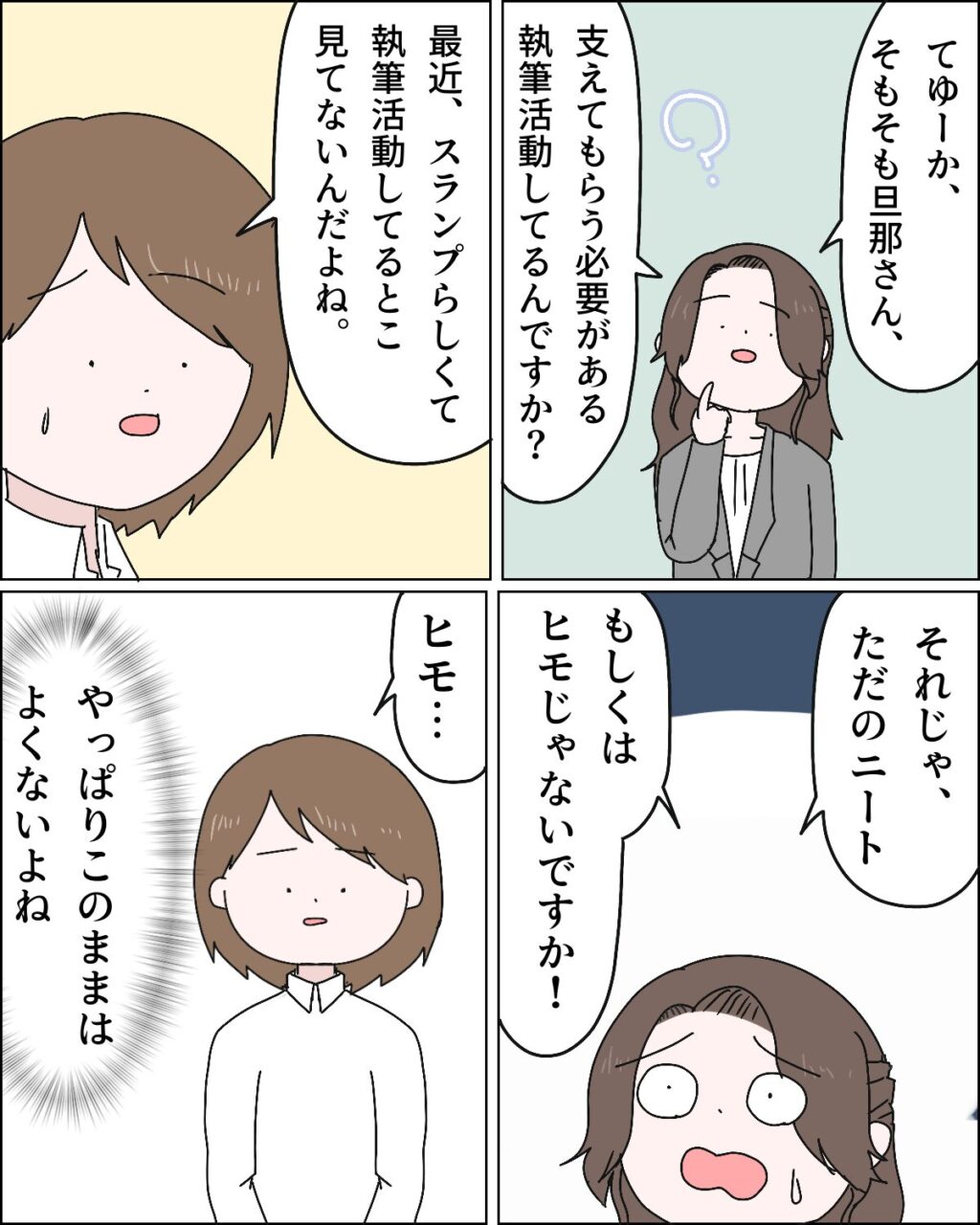 フミヤさんが仕事を辞めて3か月。たった数日で家事を折半に戻し、ナツさんの負担は増えるばかり。会社の後輩カナちゃんに「支えてもらう必要がある執筆活動してるんですか?」と言われ、執筆しているところすら見ていない自分を振り返って「このままはよくないよね」と覚悟を決めたナツさんが問い詰めると、さっきまでスマホを触っていたフミヤさんが、突然伏し目がちに!とてもじゃないけど「支える必要のある活動」をしているようには見えませんよね。
