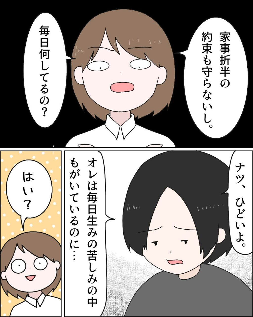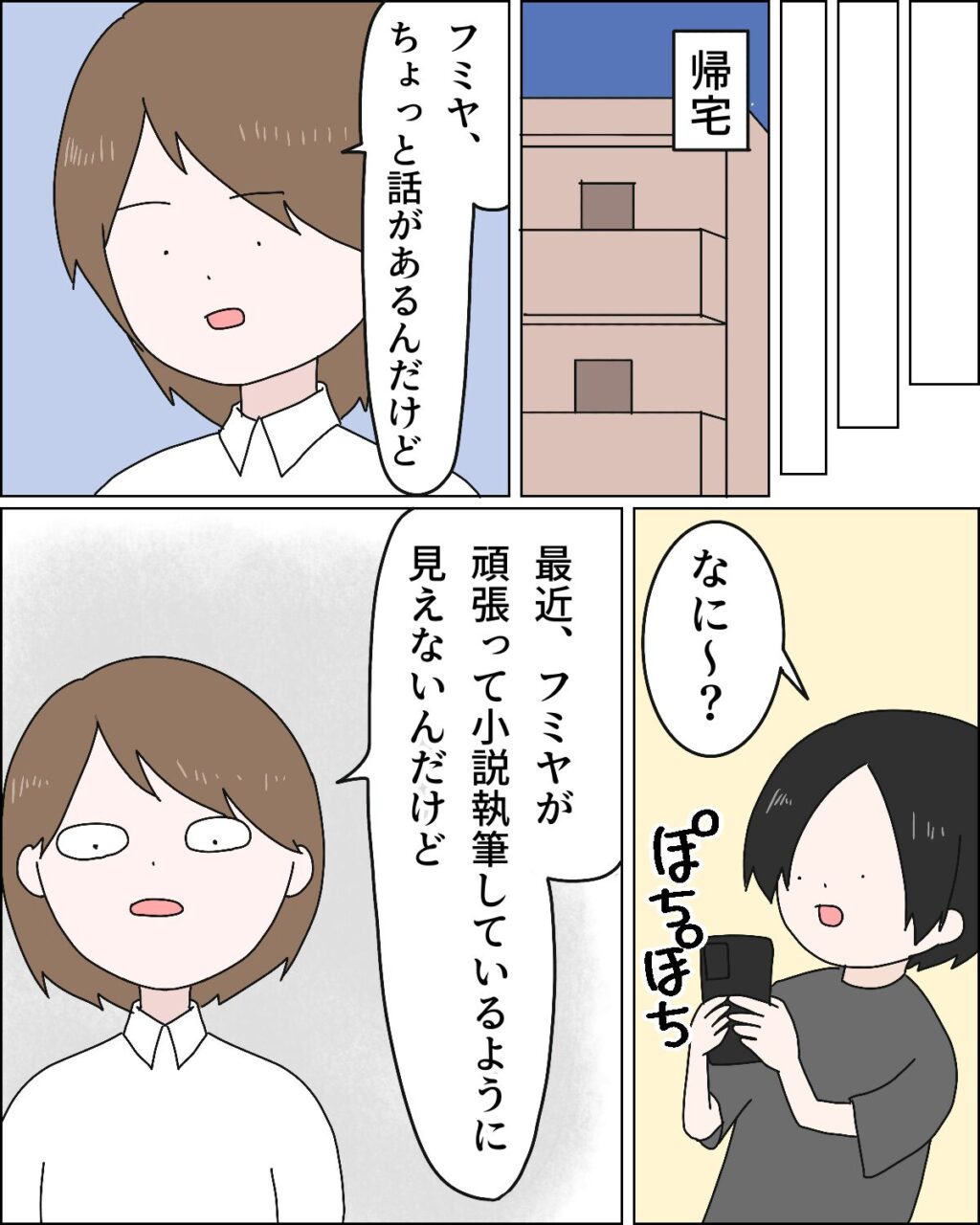 家事を全くしなくなった夫フミヤを問い詰めると、「家事の不出来を責めないで。創作活動ってものすごく疲れるんだよ」と言われ、結局家事は折半に戻すことに。その後、小説を書く姿は全く見られず、パソコンに埃がかぶっているのを見てフミヤを問い詰めるも、「いつでも書けるわけじゃない」と反論されてしまいました。そしてある日、夜中の物音で目を覚ますと、ゲームに夢中になっているフミヤの姿がありました。