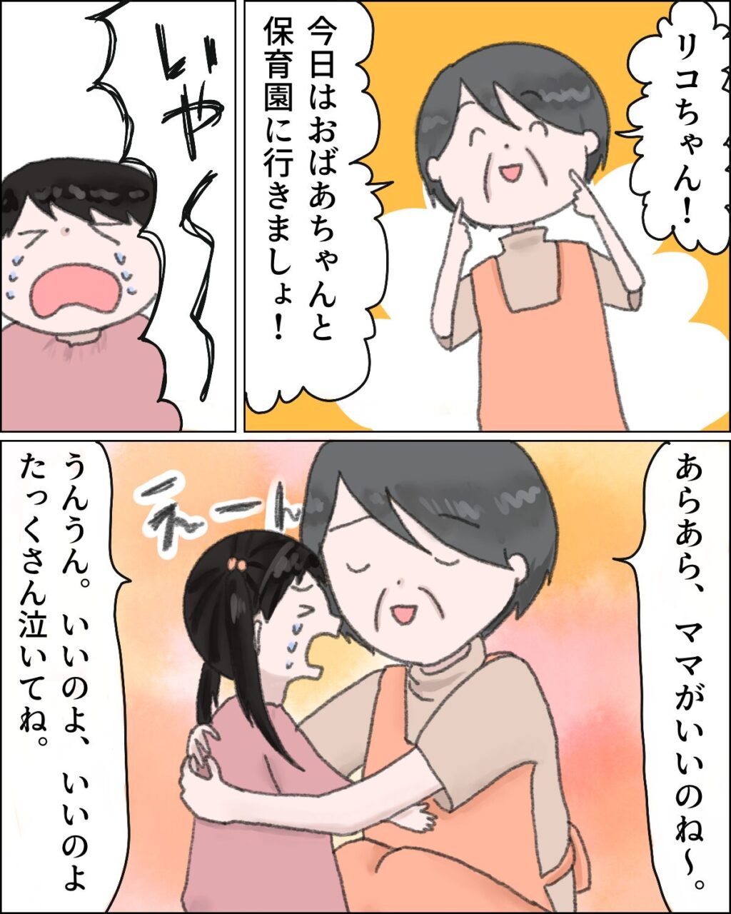 「リコちゃん!今日はおばあちゃんと保育園に行きましょ!」おばあちゃんにそう言われ、「いやーーーー!!」と泣き出すリコ。すると「あらあら、ママがいいのね~。うんうん。いいのよ、いいのよ。たっくさん泣いてね」と母はリコを抱きしめて言いました。