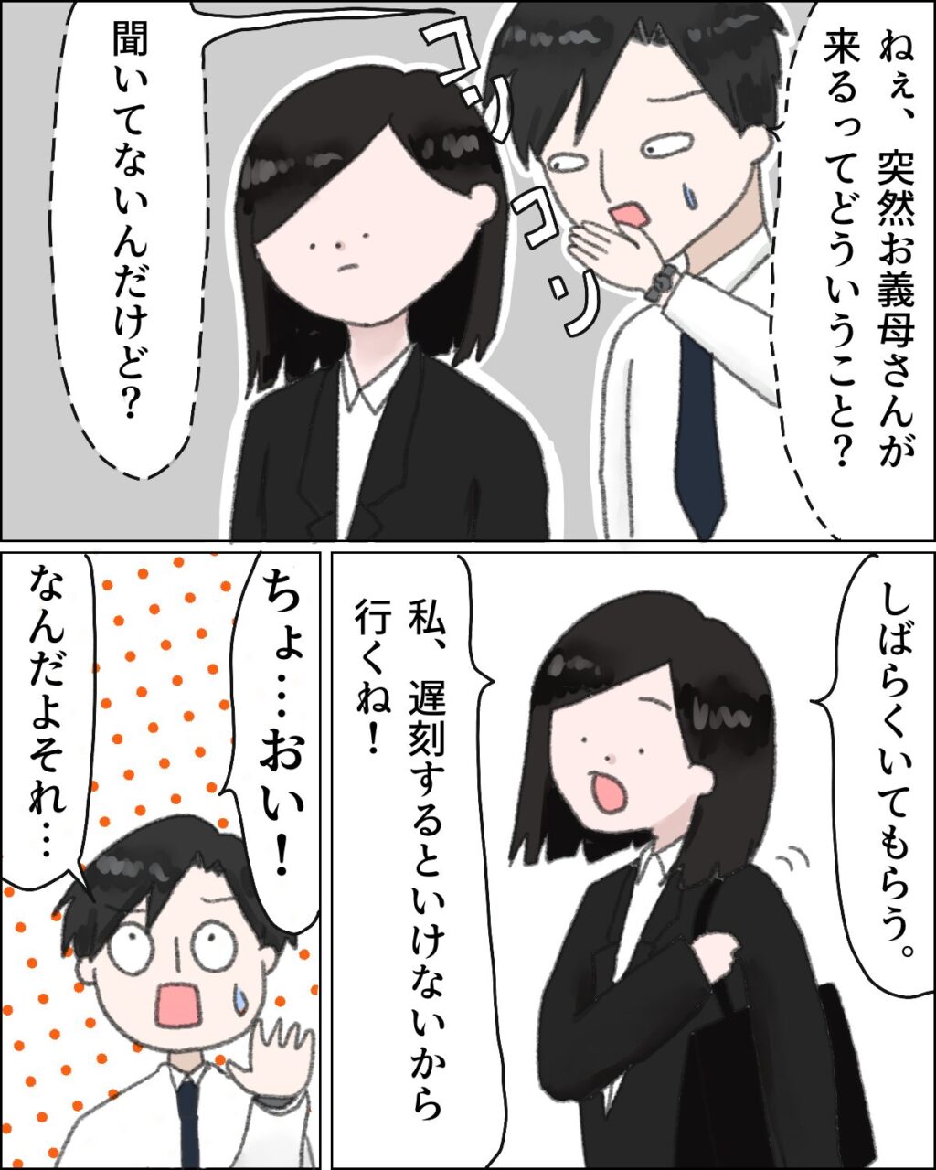 「ねぇ、突然お義母さんが来るってどういうこと?聞いてないんだけど?」カズヒデにたずねられ、「しばらくいてもらう。私、遅刻するといけないから行くね!」そう言って出かけようとする私に、「ちょ・・おい!なんだよそれ・・」と慌てるカズヒデ。