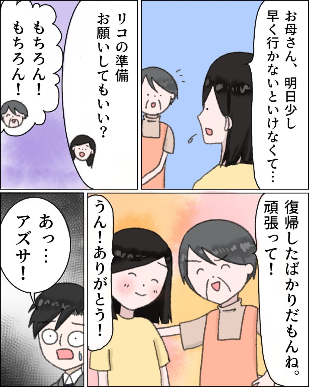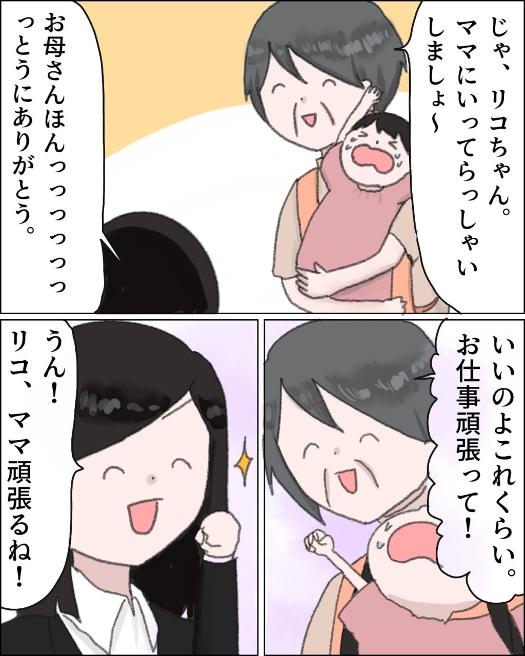 そして、「じゃ、リコちゃん。ママにいってらっしゃいしましょ~」と言う母に、「お母さんほんっっっとうにありがとう」とお礼を言うと、「いいのよこれくらい。お仕事頑張って!」「うん!リコ、ママ頑張るね」と快く見送ってくれました。