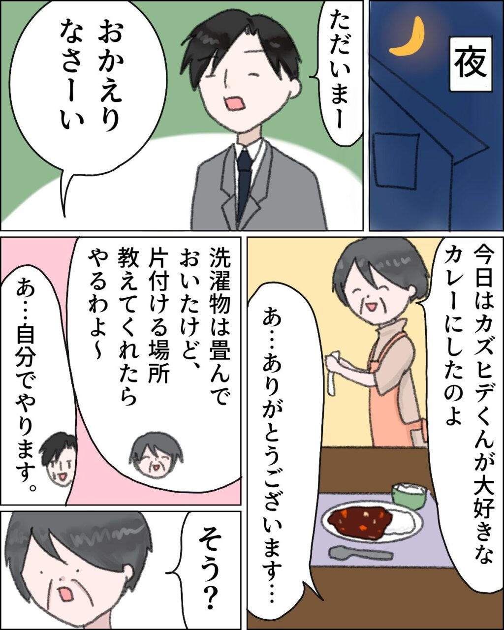 「ただいまー」カズヒデの声に「おかえりなさーい」と答えるのは母。「今日はカズヒデくんが大好きなカレーにしたのよ」そう言われて「あ・・ありがとうございます」カズヒデが答えると、「洗濯物は畳んでおいたけど、片付ける場所教えてくれたらやるわよ~」母の言葉に「あ・・自分でやります」と遠慮するカズヒデに「そう?」と母。