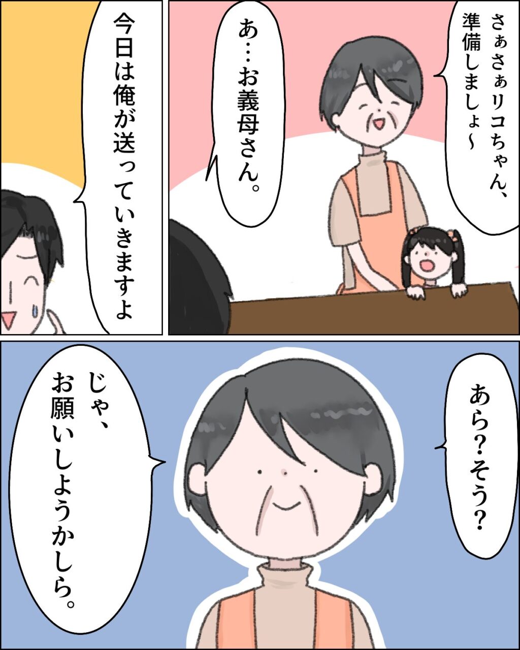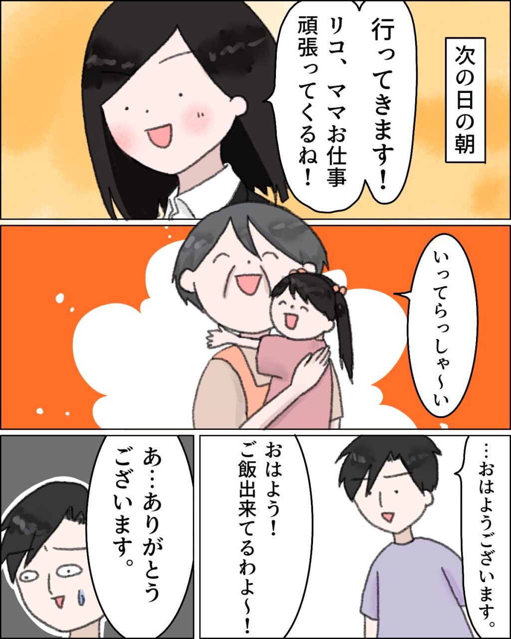 「行ってきます!リコ、ママお仕事頑張ってくるね!」そう言うと、「いってらっしゃ~い」と見送ってくれるリコと母。その後、少し遅れて起きてきたカズヒデは「おはよう!ご飯出来てるわよ~!」と母に言われて居心地悪そうに「ありがとうございます」と言うしかありませんでした。