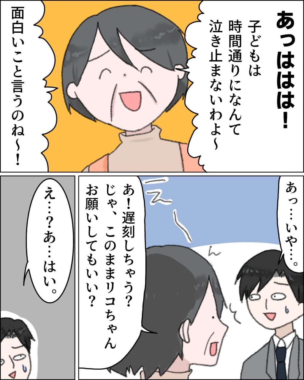 「あっははは!子どもは時間通りになんて泣き止まないわよ~。面白いこと言うのね~!」と笑う母に、「あっ・・いや・・」と言葉を濁すカズヒデ。「あ!遅刻しちゃう?じゃ、このままリコちゃんお願いしてもいい?」母にそう言われ、「え・・?あ・・はい」と答えるカズヒデ。