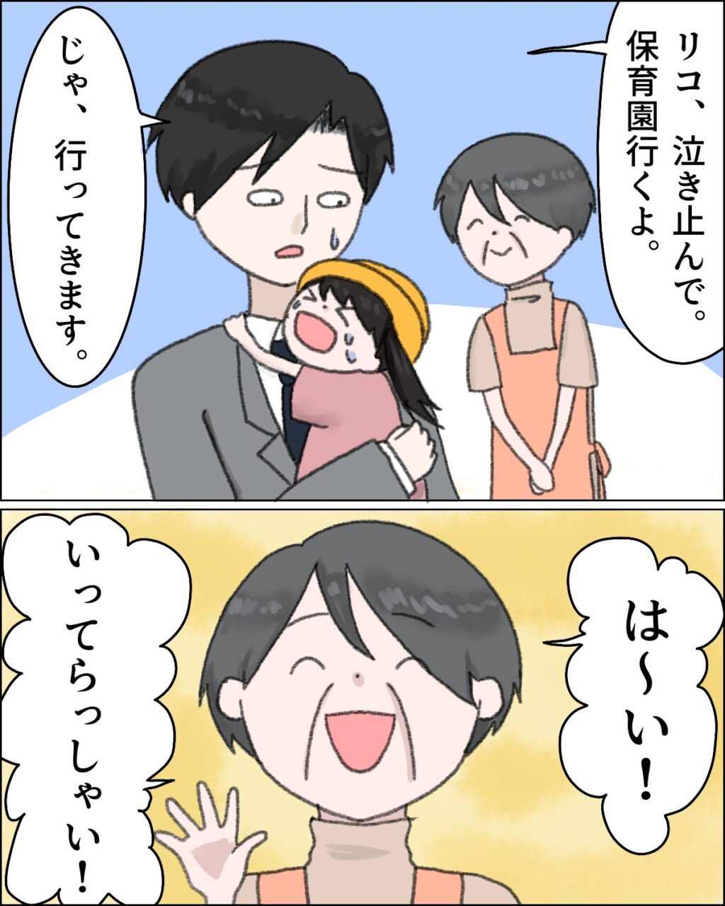 そして、「リコ、泣き止んで。保育園行くよ」そう話しかけた後、「じゃ、行ってきます」と母に声をかけるカズヒデ。母は、「は~い!いってらっしゃい!」と笑顔で見送りました。
