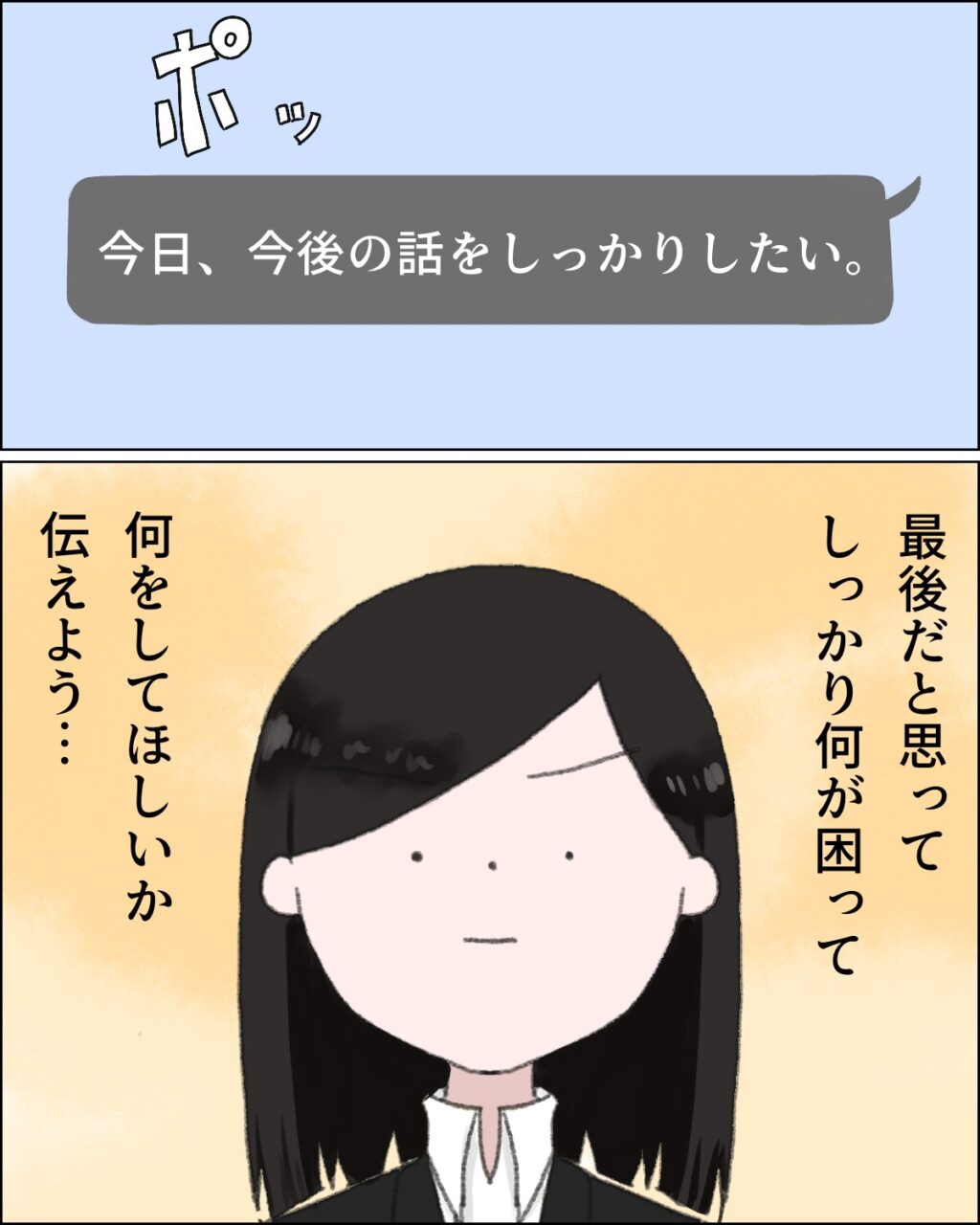 、「今日、今後の話をしっかりしたい」とメッセージを送り、「最後だと思ってしっかり何が困って、何を伝えてほしいか伝えよう・・」と心の中で決めました。