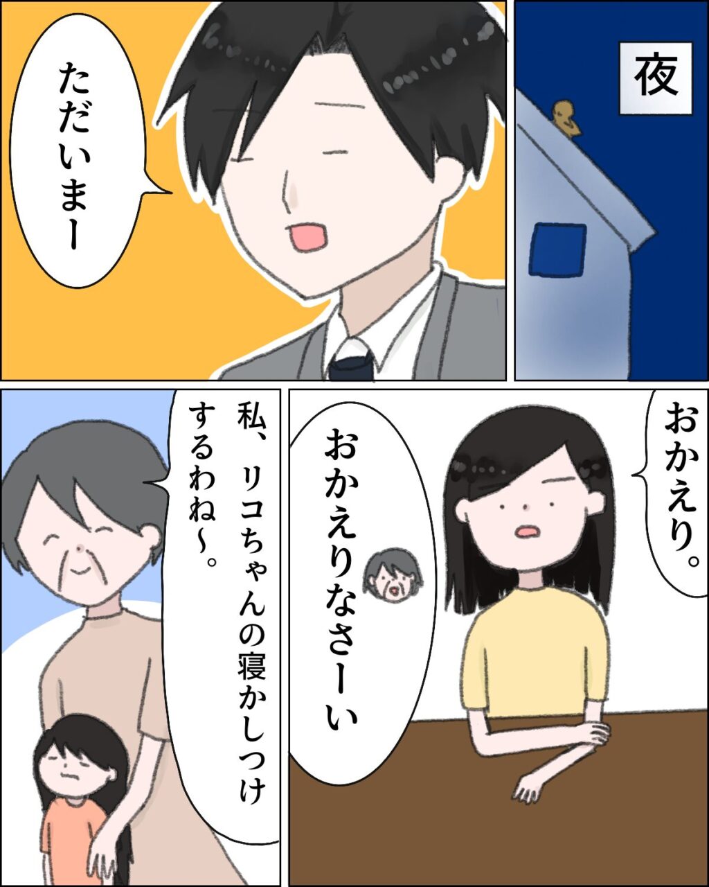 「ただいまー」帰ってきたカズヒデを待ち構えていた私が「おかえり」と声を、「おかえりなさーい」と母親が言い、「私、リコちゃんの寝かしつけするわね~」そう言って寝室へ行きました。