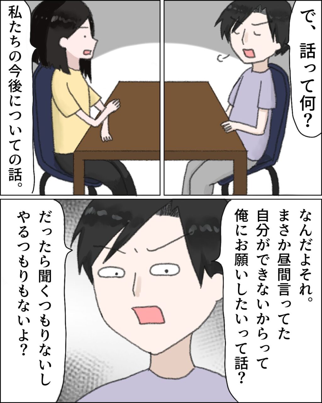 そして、「で、話って何?」と機嫌悪そうに言うカズヒデに、「私たちの今後についての話」と答えると、「なんだよそれ。まさか昼間言ってた、自分ができないからってオレにお願いしたいって話?だったら聞くつもりもないし、やるつもりもないよ」と冷たい口調で言いました。