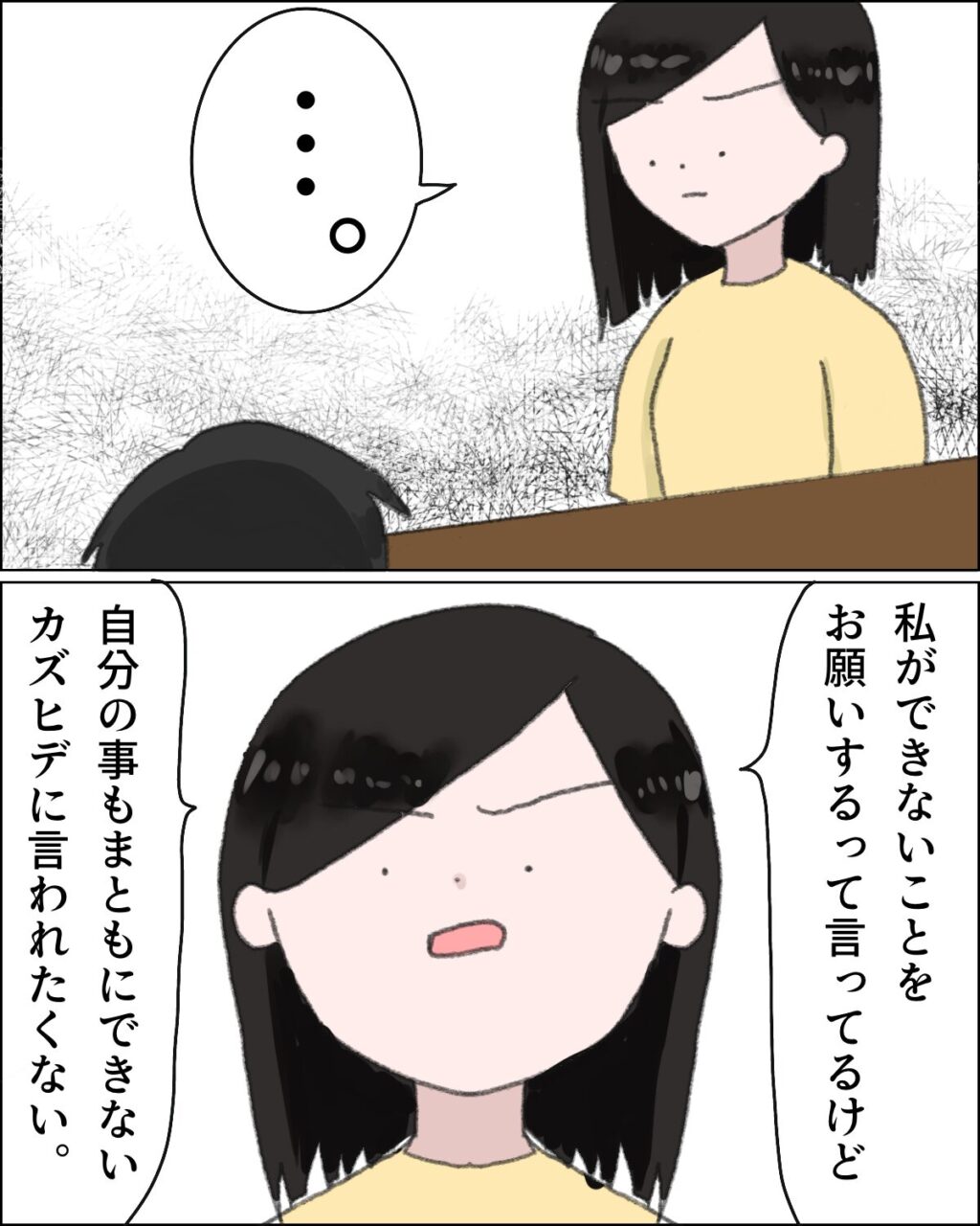 「・・・」カズヒデの言葉に思わず無言になる私は、「私ができないことをお願いするって言ってるけど、自分の事もまともにできないカズヒデに言われたくない」と目を見据えてキッパリと言いました。