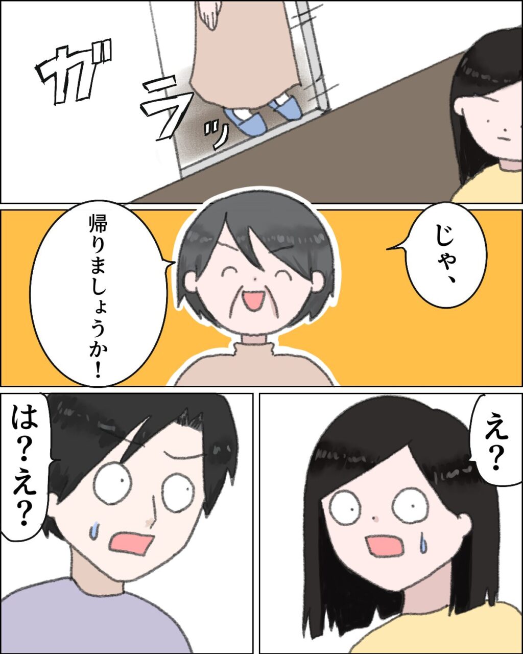 すると、ガラッとドアが開いて、「じゃ、帰りましょうか!」と笑顔で言う母。母の言葉に「え?」と驚く私と、「は?え?」と動揺するカズヒデ。