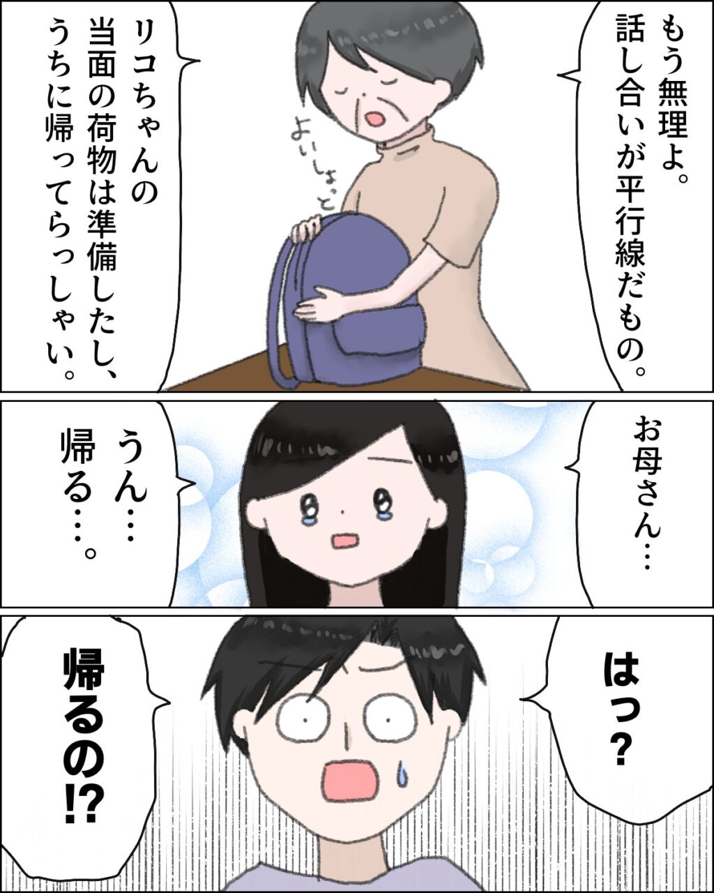 「もう無理よ。話し合いが平行線だもの。リコちゃんの当面の荷物は準備したし、うちに帰ってらっしゃい」そう言ってリュックを持って来た母に、「お母さん・・うん・・帰る・・」と涙ぐみながら答えると、「はっ?帰るの!?」カズヒデが驚いて言いました。