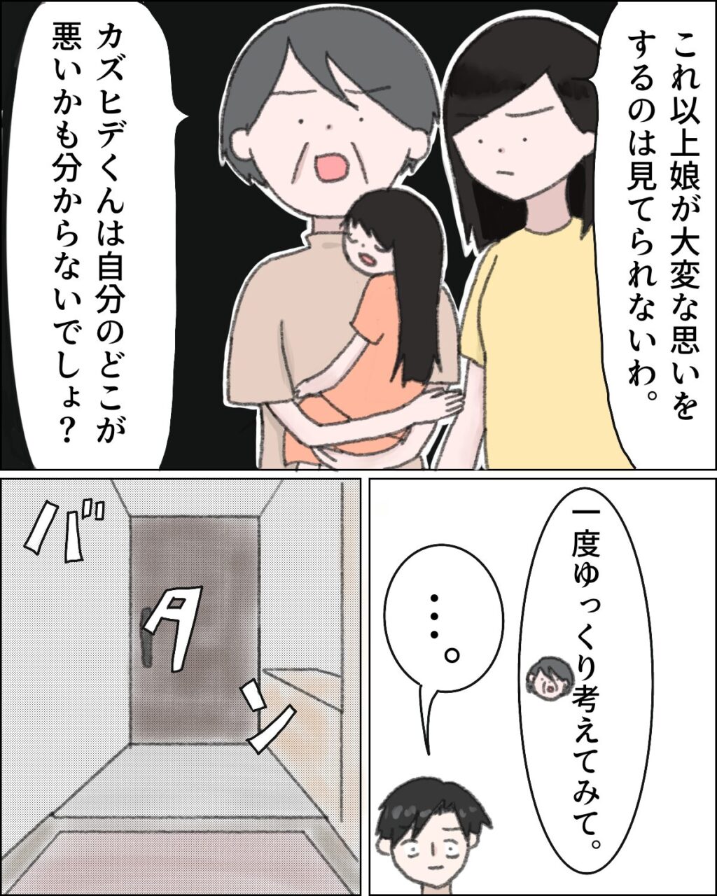 「これ以上娘が大変な思いをするのは見てられないわ。カズヒデくんは自分のどこが悪いかも分からないでしょ?」そう言うと、「一度ゆっくり考えてみて」母はそう言って部屋から出て行きました。