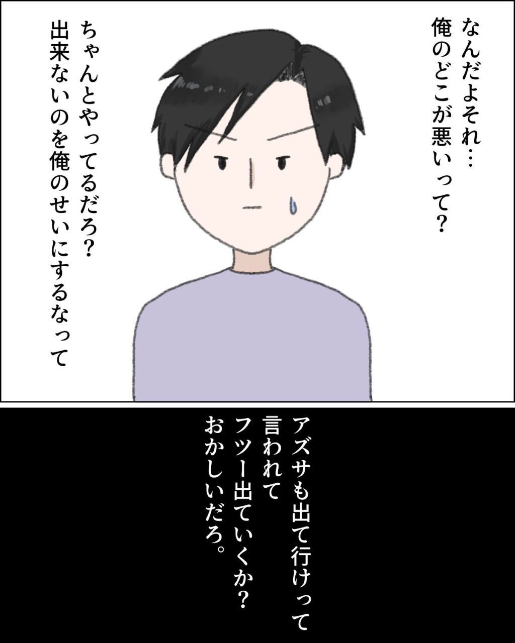 「なんだよそれ・・俺のどこが悪いって?ちゃんとやってるだろ?出来ないのを俺のせいにするなって。アズサも出て行けって言われてフツー出ていくか?おかしいだろ」と誰もいない部屋で呟きました。