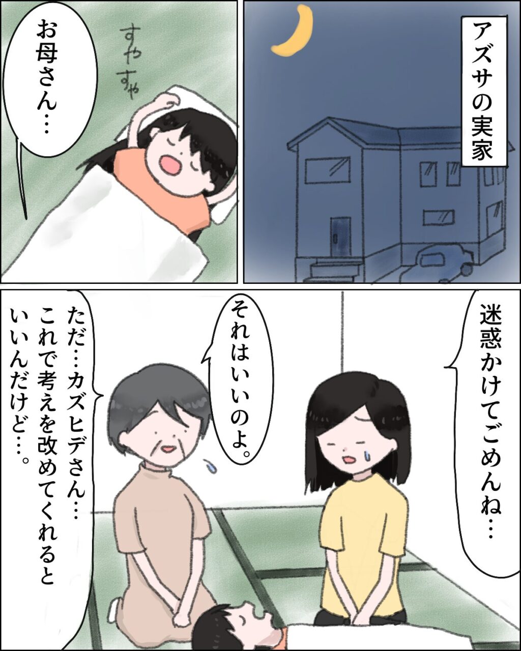 リコが眠った後、「お母さん・・迷惑かけてごめんね・・」そう言って謝ると、「それはいいのよ。ただ・・カズヒデさん・・これで考えを改めてくれるといいんだけど・・と義母が静かに言いました。