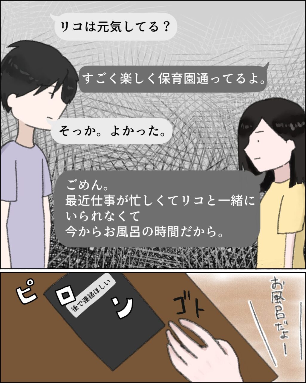 久しぶりに仕事が早く終わりリコとの親子時間を満喫していると、カズヒデから『リコは元気してる?』とメッセージが届きました。『すごく楽しく保育園通ってるよ』と返信した後、『ごめん。最近仕事が忙しくてリコと一緒にいられなくて、今からお風呂の時間だから』と送ると私はスマホを置きました。その直後にカズヒデから『後で連絡ほしい』というメッセージが届いていたのですが、私はそれに気付かないままリコとお風呂に入っていました。