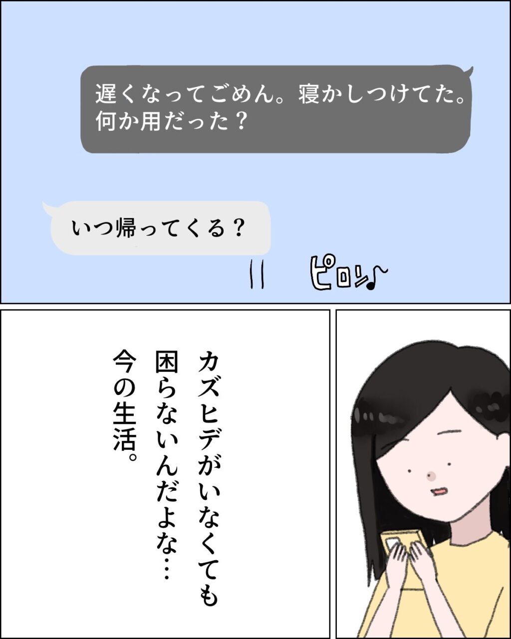 慌てて『遅くなってごめん。寝かしつけてた。何か用だった?』とメッセージを送ると、すぐに返信がきました。『いつ帰ってくる?』というカズヒデからの返信を見た私は、一瞬フリーズ。「カズヒデがいなくても困らないんだよな・・今の生活」今の生活に満足していた私は、カズヒデのいる家に帰るという選択肢が浮かびませんでした。