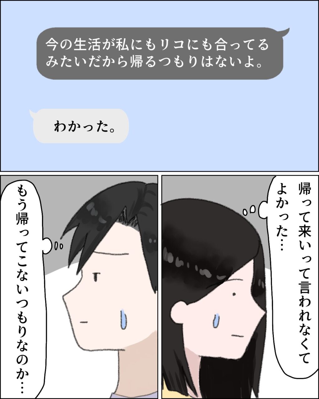 『今の生活が私にもリコにも合ってるみたいだから帰るつもりはないよ』正直にそう送ると、カズヒデからは『わかった』という一言だけが返ってきました。このとき、私は「帰って来いって言われなくてよかった・・」とホッとしていましたが、カズヒデは「もう帰ってこないつもりなのか・・」と焦っていたようです。