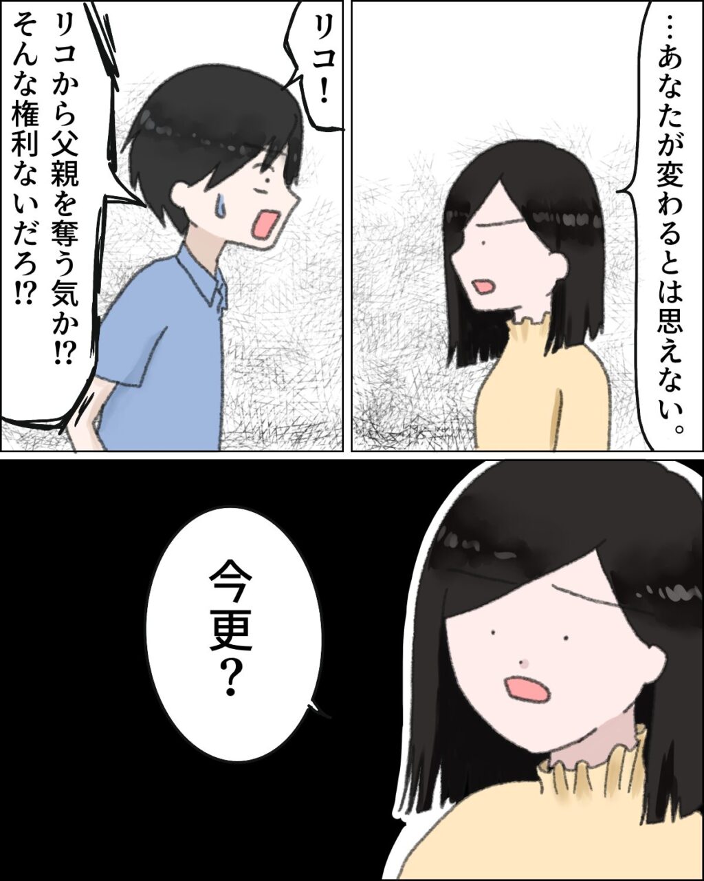 「俺が・・俺が変わったら戻ってきてくれるのか?」と私に聞くカズヒデ。私は「・・・あなたが変わるとは思えない」と言いました。すると「リコ!リコから父親を奪う気か!?そんな権利ないだろ!?」とリコを話に出して引き留めようとしてきました。私からすると「今更?」という感じです。