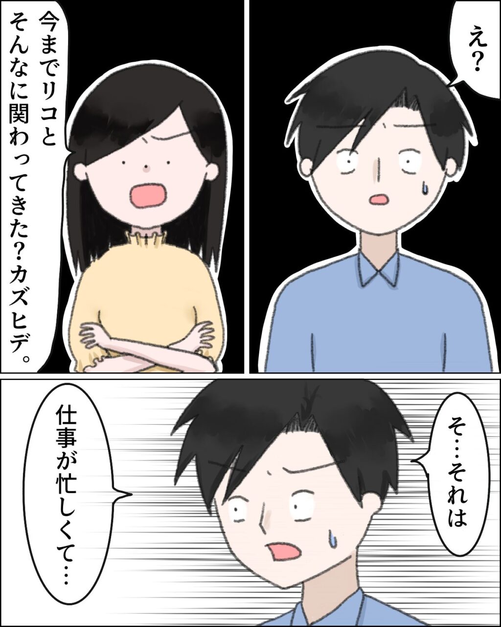 カズヒデが「え?」と理解できてないようなので「今までリコとそんなに関わってきた?」と言いました。カズヒデは「そ・・・それは仕事が忙しくて・・・」と言い訳。