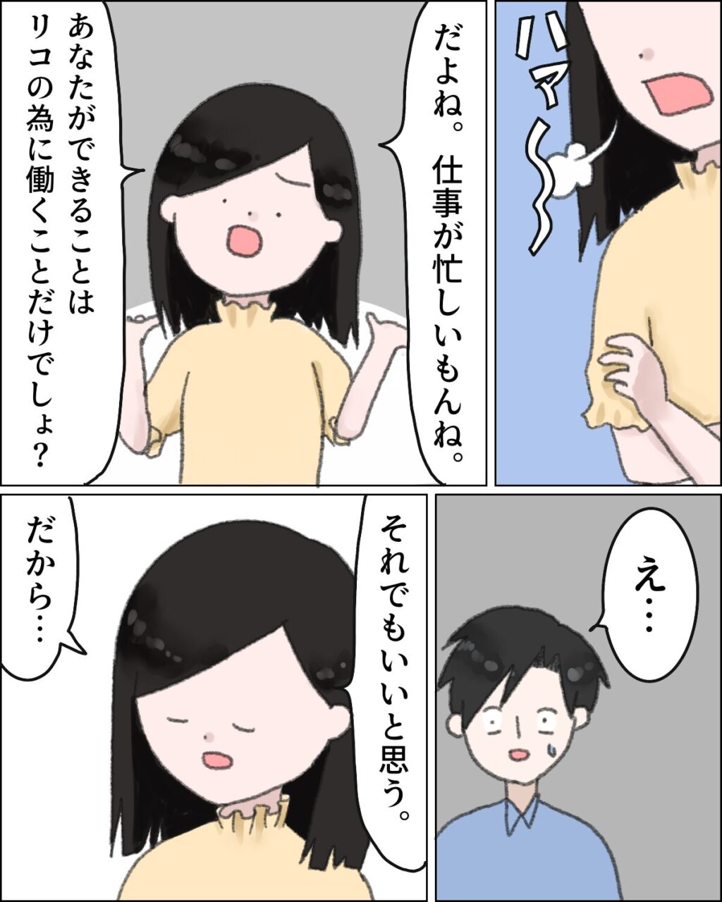 もう、ため息しかでません。私はカズヒデに「だよね。仕事が忙しいもんね。あなたができることはリコの為に働くことだけでしょ?」と言いました。驚くカズヒデに「それでもいいと思うだから・・・」