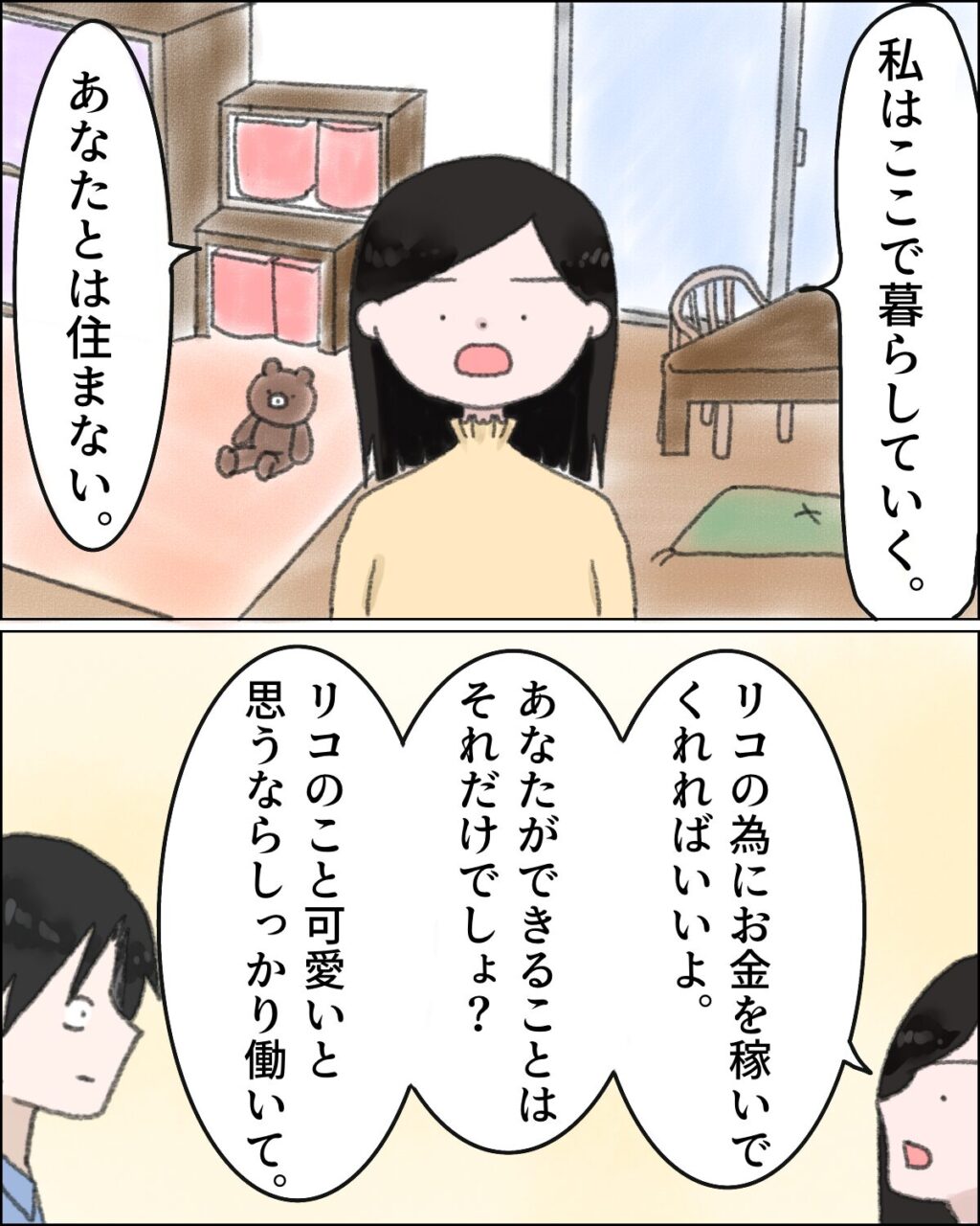 「私はここで暮らしていく。あなたとは住まない。」としっかり伝えました。そして「リコの為にお金を稼いでくれればいいよ。あなたができることはそれだけでしょ?リコのこと可愛いと思うならしっかり働いて」と・・・