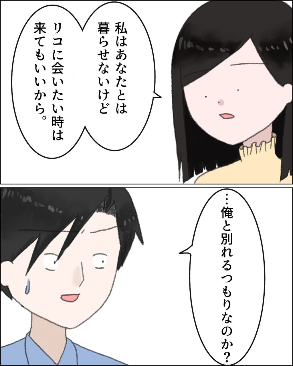 「私はあなたとは暮らせないけどリコに会いたい時は来てもいいから」とカズヒデに伝えました。カズヒデは恐る恐る「・・・俺と別れるつもりなのか?」と呟きました。
