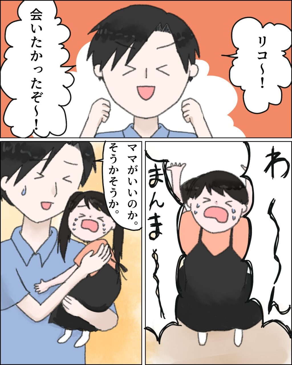 カズヒデと出かける約束をしている週末になりました。私とリコを迎えに来たカズヒデは、「リコ~、会いたかったぞ~」と嬉しそうに張り切っていましたが、リコはカズヒデの姿を見て泣き出してしまいました。今までなら泣いているリコはすぐに私に任せてしまうカズヒデでしたが、今日はリコが「まんまー」と私を求めてどれだけ泣いても、優しく「ママがいいのか。そうかそうか。」とリコを抱っこし続けています。