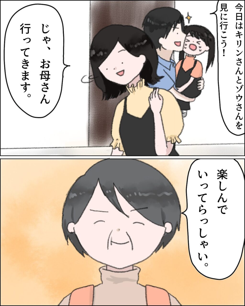 カズヒデは「今日はキリンさんとゾウさんを見に行こう!」とリコを抱っこしながら明るく話しかけました。「じゃ、お母さん行ってきます。」そう言って出かける私たち家族を、母は「楽しんでいってらっしゃい。」笑顔で送り出してくれました。