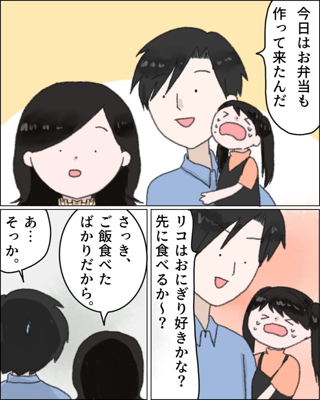 「今日はお弁当も作ってきたんだ」と、カズヒデは言ってまだ泣いているリコに「リコはおにぎり好きかな?先に食べるか~」と言いました。「さっき、ご飯食べたばかりだから。」つい素っ気なく言ってしまう私にもカズヒデは機嫌を損ねることなく「あ・・・そっか。」と気にしない様子。