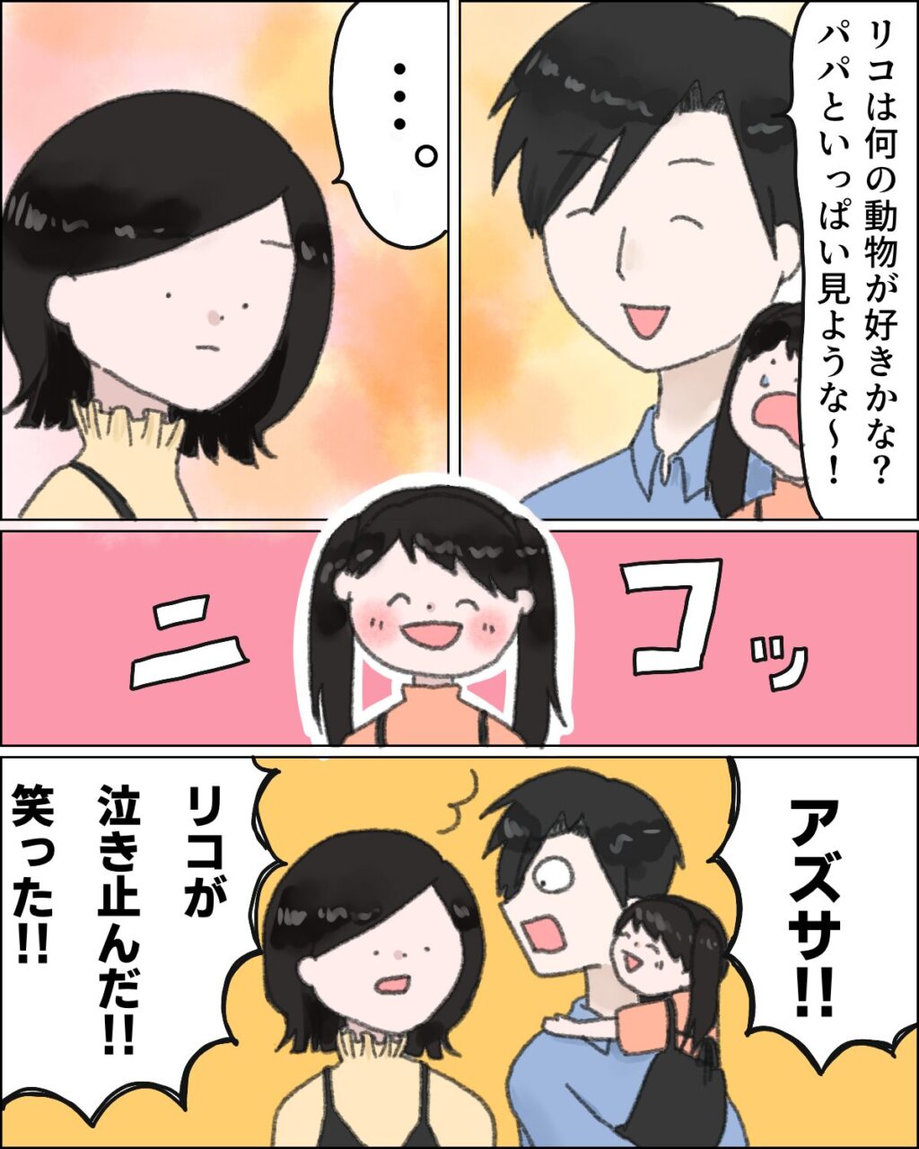 気を取り直して「リコは何の動物が好きかな?パパといっぱい見ような~!」と話しかけます。抱っこされながら、だんだん落ち着きを取り戻してきたようにカズヒデの顔を見上げるリコ。そんな2人を私はまだ半信半疑で見つめていました。だって、人ってそんなに簡単に変われないもん。そう思った瞬間、ずっと泣いていたリコがニコッとアズサに笑顔を見せたのです。
