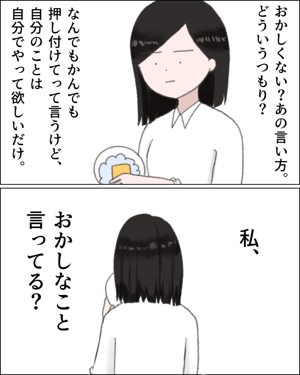 夜になっても朝のカズヒデの発言にモヤモヤしていました。「おかしくない?あの言い方。どういうつもり?なんでもかんでも押し付けてって言うけど、自分のことは自分でやって欲しいだけ。私、おかしいこといってる?」