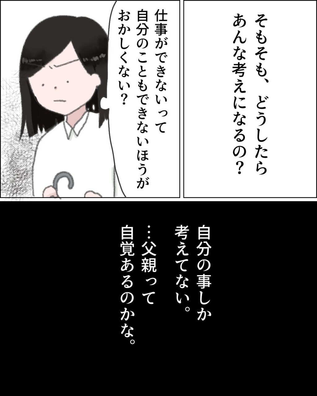 「そもそも、どうしたらあんな考えになるの?仕事ができないって自分のこともできないほうがおかしくない?自分の事しか考えてない。」父親って自覚あるのかなと、私は心の中で考えていました。