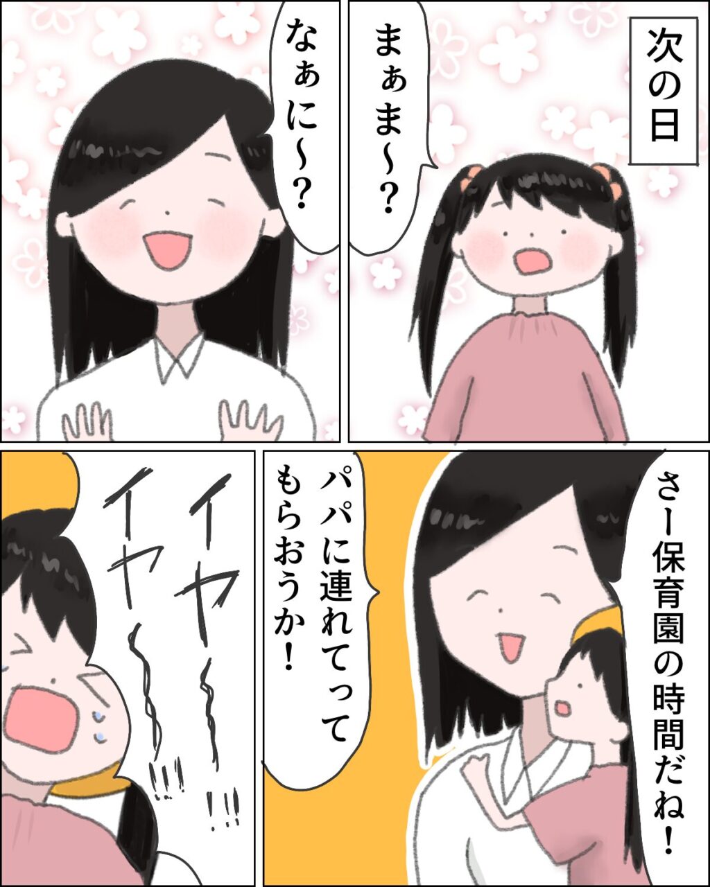 次の日、「まぁま~?」と呼ぶリコ。私は笑顔で「なぁに~?さー保育園の時間だね!パパに連れてってもらおうか!」と元気よく言いました。するとリコは「イヤ~!!イヤ~!!」と大泣き。