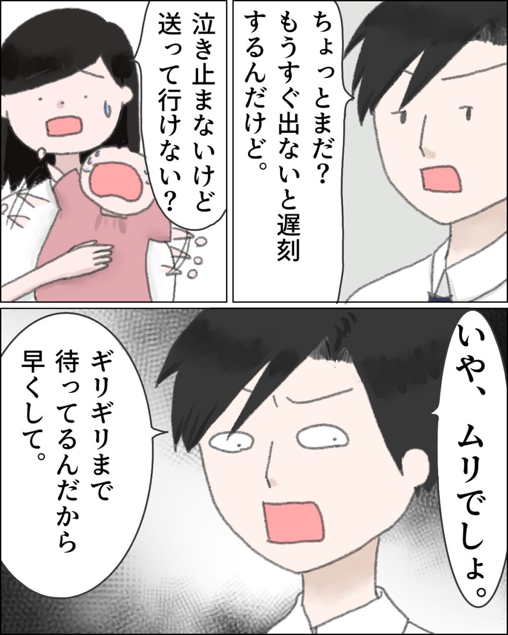 カズヒデは「ちょっとまだ?もうすぐ出ないと遅刻するんだけど。」と言いました。私は「泣き止まないけど送ってくれない?」とお願いすると「いや、ムリでしょ。ギリギリまで待ってるんだから早くして。」とイライラし始めます。