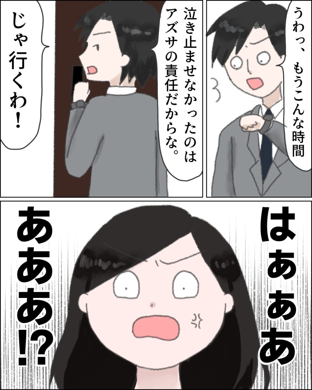 なかなか泣き止まないリコ。カズヒデは「うわっ、もうこんな時間。泣き止まなかったのはアズサの責任だからな。じゃ、行くわ!」と急いで玄関を出ていきました。その行動に私は「はぁああああああ!?」と怒りが頂点に達したのでした。