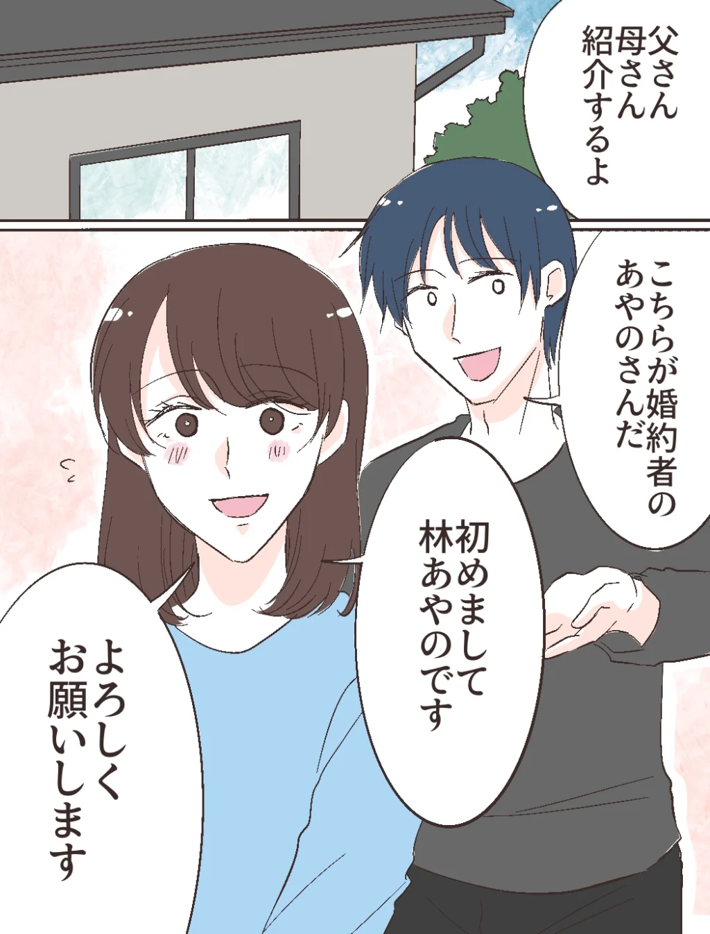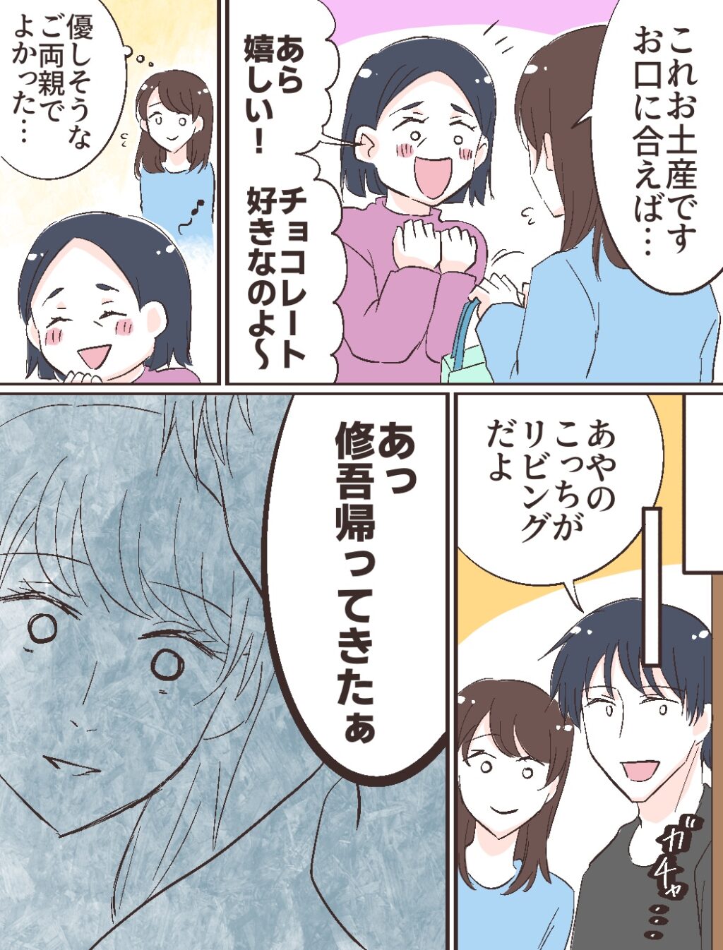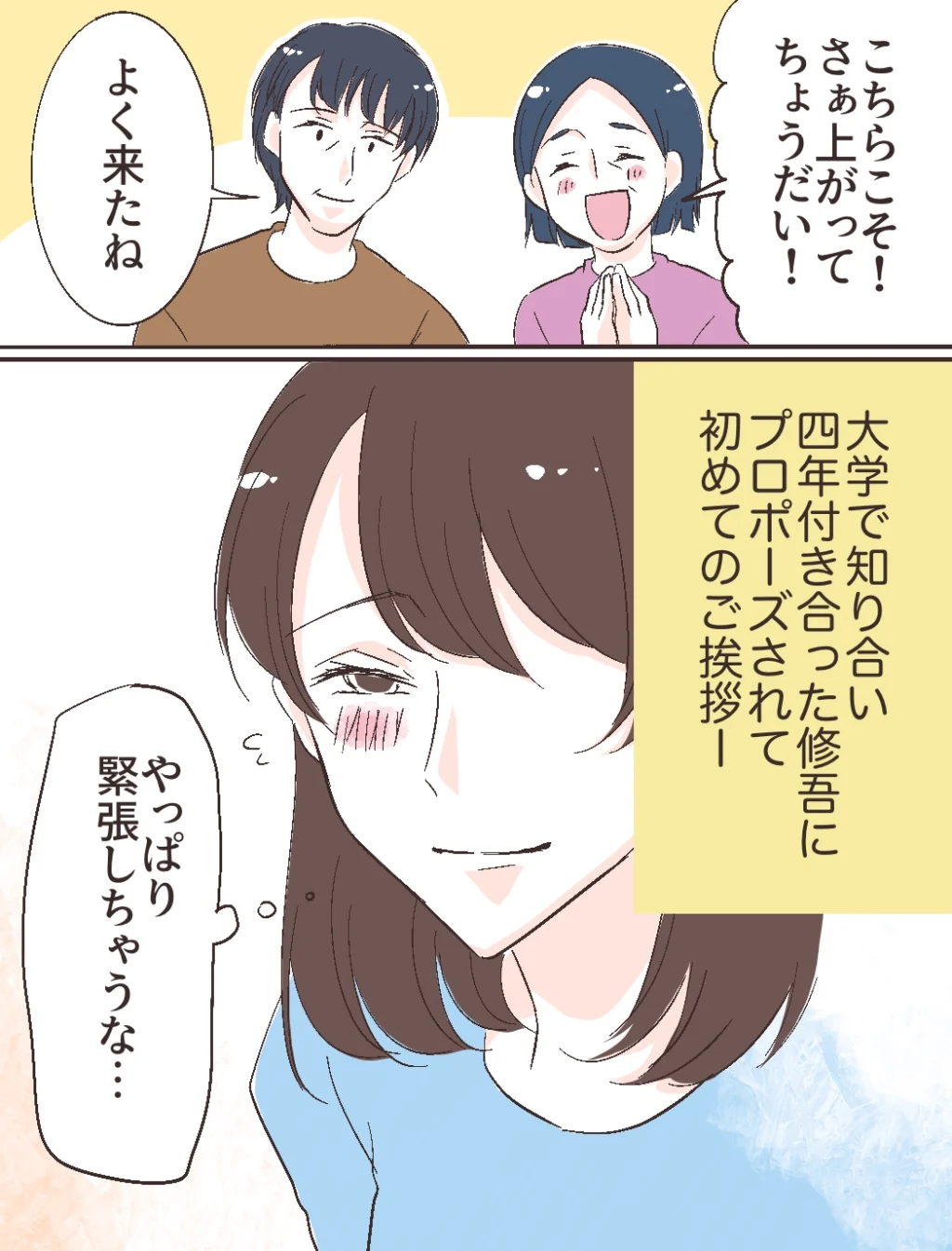 修吾のご両親は「こちらこそ!さぁ上がってちょうだい!」「よく来たね」と笑顔で私を迎えてくれました。大学で知り合って4年付き合った修吾にプロポーズされて、今日は初めてのご挨拶。ご両親の優しさにホッとしつつも、やはり緊張します。