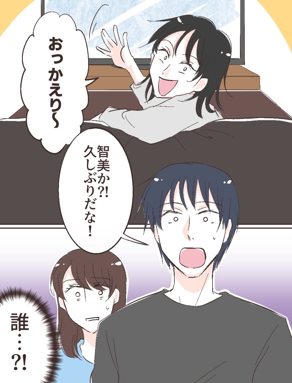 リビングのソファに座っていた私と同年代くらいの女性が「おっかえり~」と修吾に手を振りました。女性を見た修吾は「智美か?!久しぶりだな!」と驚いた様子で言いました。えっと・・智美って誰?!