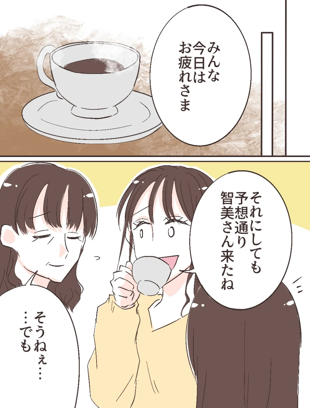 帰宅後、私はコーヒーを淹れて母とふみのとまったりしていました。すると、ふみのが「それにしても、予想通り智美さん来たね」と切り出しました。「そうねぇ・・」と穏やかに答えた母でしたが、少しの間のあと「・・でも」と続けました。