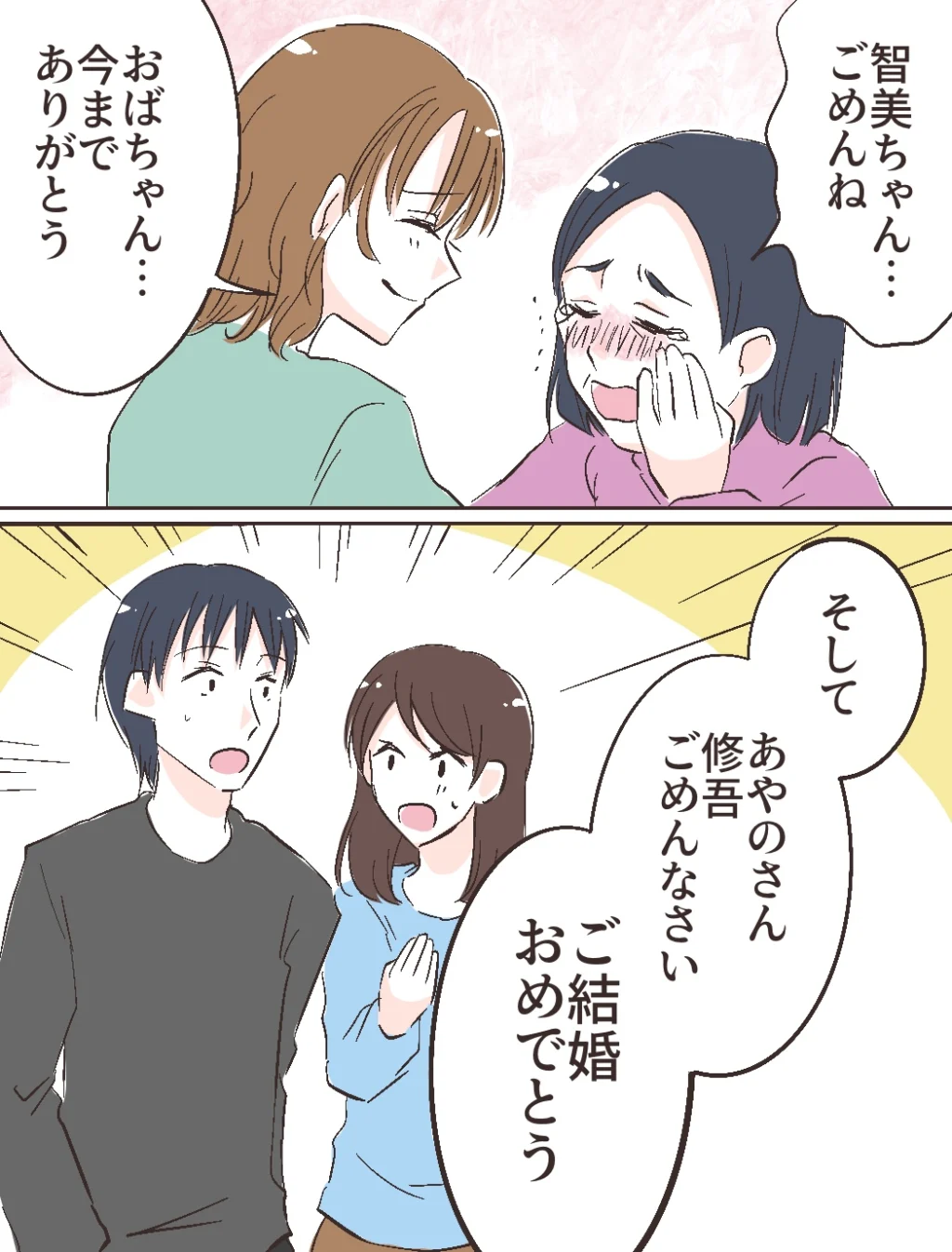 義母はすっかり雰囲気の変わった智美さんの姿を見て、涙をこぼしました。そして声を震わせながら「智美ちゃん、ごめんね」と心からの謝罪を口にします。智美さんはその言葉を受け止め、「おばちゃん・・・今までありがとう」と感謝を伝えました。そして智美さんは私と修吾の方へ視線を向けると、「あやのさん修吾、ごめんなさい・・・ご結婚おめでとう」と初めて祝福の言葉をかけてくれたのです。