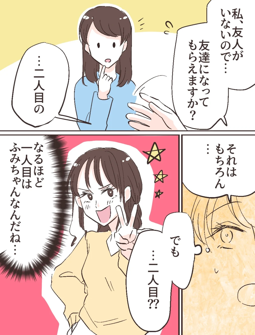 すると智美さんはもじもじしながら、「私、友人がいないので友達になってもらえますか?・・・2人目の」そう言って、私にそっと手を差し出してきました。友達になるのはもちろん構いませんが・・・でも、2人目?不思議に思ってふみのを見ると、なぜか自信満々のピースサイン。その姿を見て、私は「なるほど、1人目はふみちゃんなんだね」と納得しました。