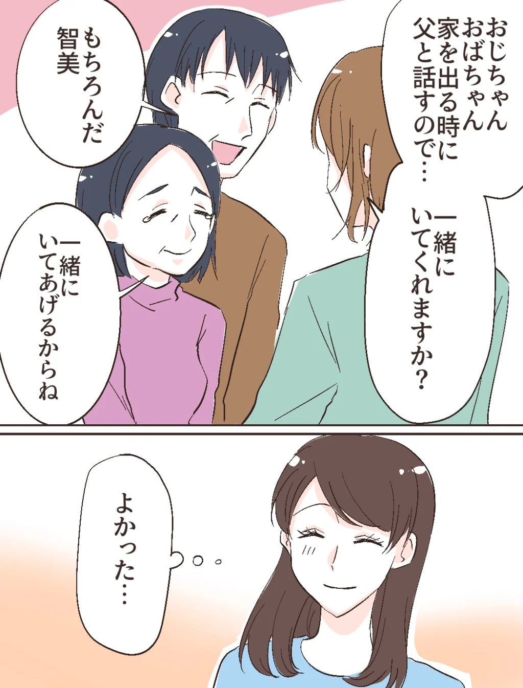 智美さんは義父と義母のもとへ歩み寄ると、「おじちゃん、おばちゃん・・・家を出る時に父と話すので一緒にいてくれますか?」とお願いしました。2人は迷うことなく「もちろん」と即答。これでやっと、智美さんが自立する準備が整いました。