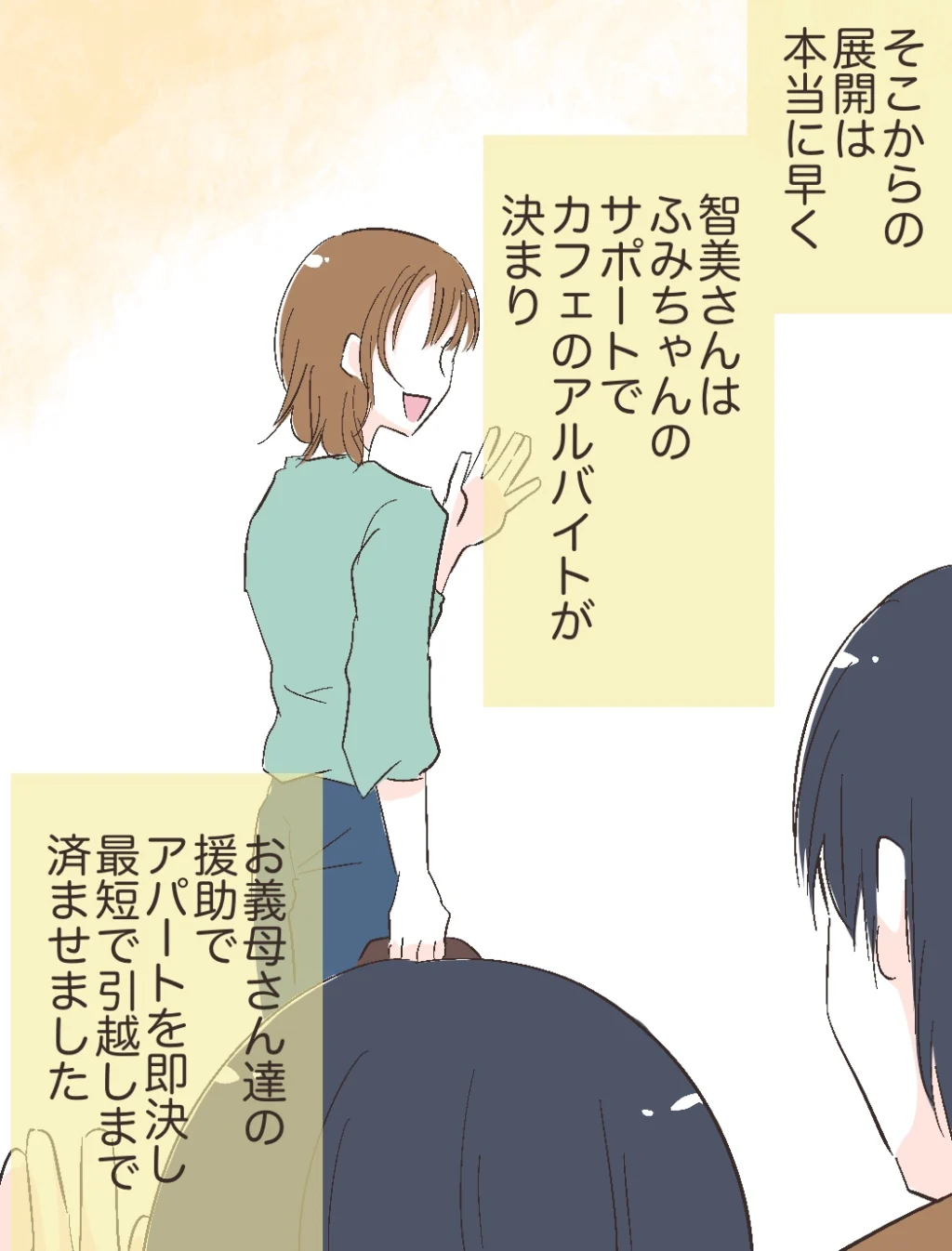 その後の展開は本当に早く、智美さんはふみちゃんのサポートでカフェのアルバイトが決まり、お義母さん達の援助でアパートを即決し、最短で引っ越しまで済ませたのでした。