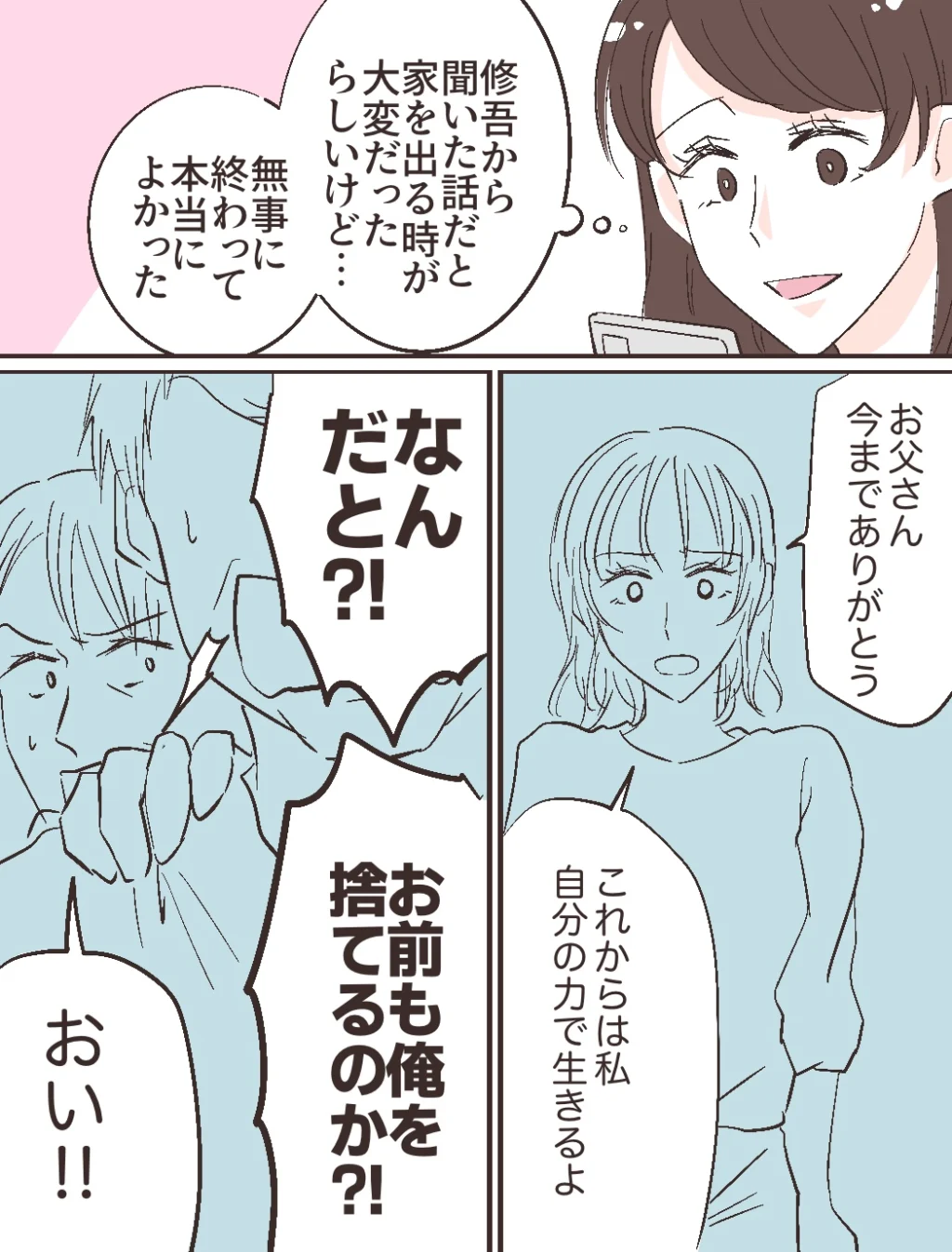 「お父さん。いままでありがとう!これからは私、自分の力で生きるよ」智美さんがそう言うと、「なんだと!?お前も俺を捨てるのか!?」と言い出す父親。すると、その背中に「おい!!」と声をかけたのは