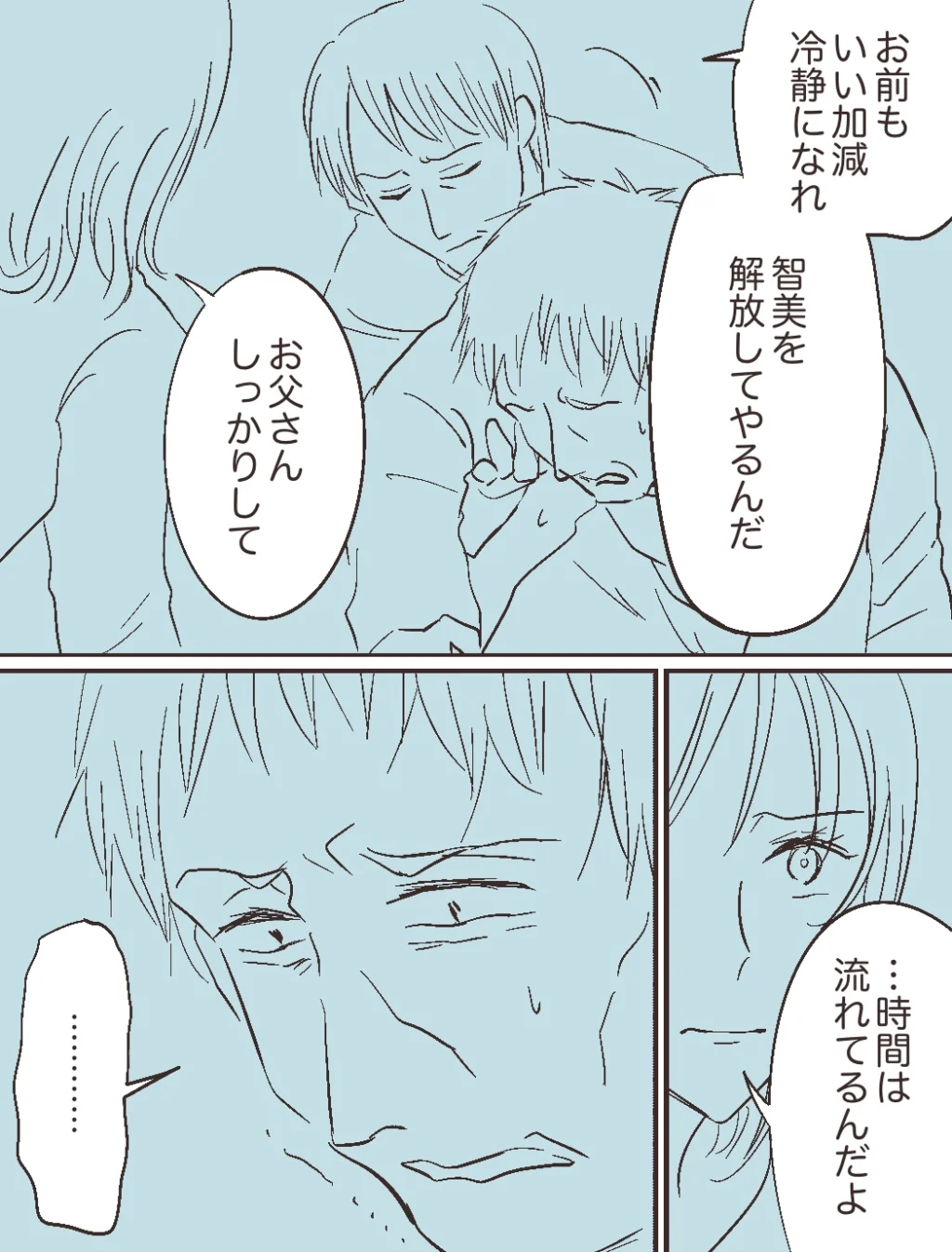 義父でした。そして「お前もいい加減冷静になれ。智美を開放してやるんだ」静かに話す義父の声を聞いて、「お父さん、しっかりして」智美さんは父親にそう言った後、「・・時間は流れてるんだよ」と静かに言い、父親は絶望的な気分を感じているようでした。