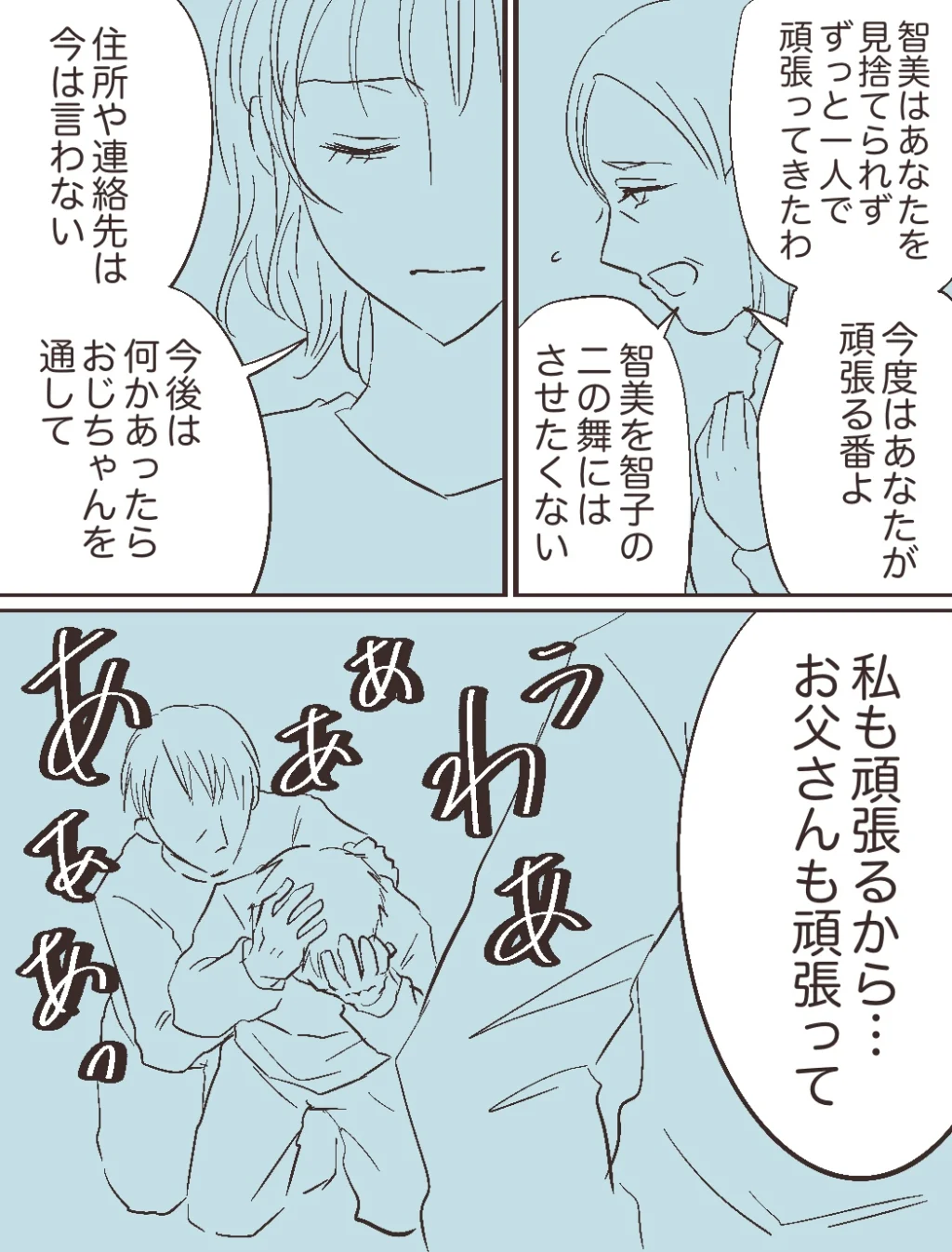 「智美はあなたを見捨てられず、ずっと一人で頑張ってきたわ。今度はあなた頑張る番よ。智美を智子の二の舞にはさせたくない」義母の言葉を聞いた智美さんは、「住所や連絡先は今は言わない。今後は何かあったらおじちゃんを通して。私も頑張るから・・お父さんも頑張って」と父親に向かって静かに言いました。