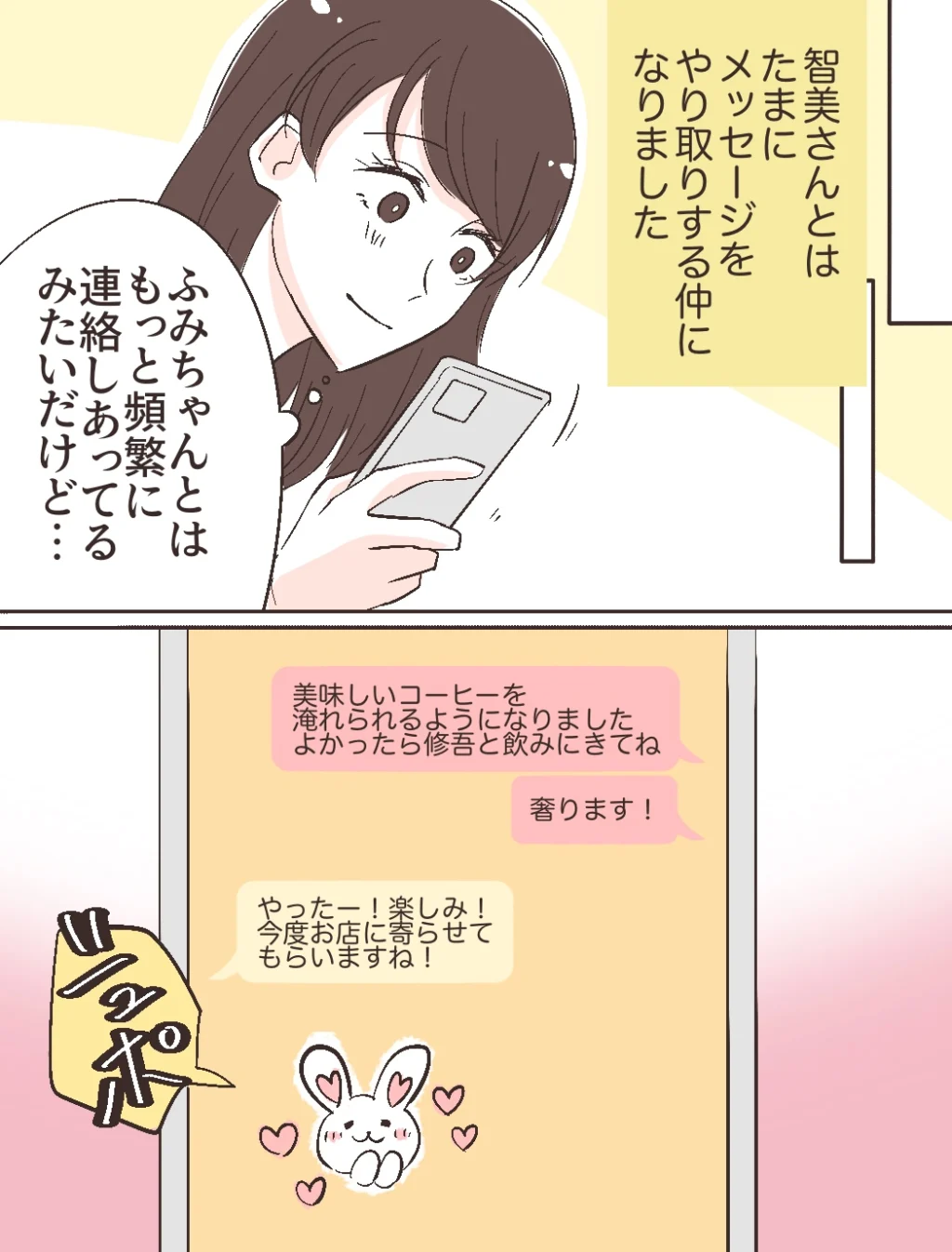 その後、智美さんとたまにメッセージをやりとりする仲になったあやのさんは、「ふみちゃんとはもっと頻繁に連絡しあってるみたいだけど・・」そう呟いていると、「美味しいコーヒーを淹れられるようになりました。よかったら修吾と飲みにきてね。奢ります!」と智美さんからメッセージが届き、「やったー!楽しみ!今度お店に寄らせてもらいますね!」と返信したのでした。