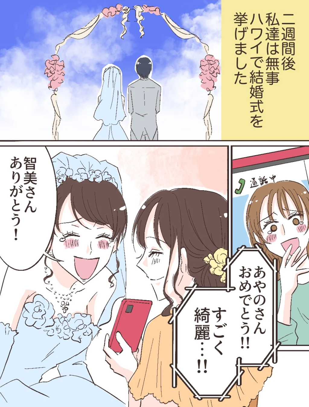 二週間後、私たちは無事ハワイで結婚式を挙げました。智美さんはビデオ通話で「あやのさん、おめでとう!!すごく綺麗・・!!」と涙ぐみながら祝ってくれ、私も「智美さん、ありがとう!」と思わず涙ぐみました。少し前までは悩みの種だった智美さんが、今は私たちの結婚を心から祝福してくれていることが本当に嬉しかったです。