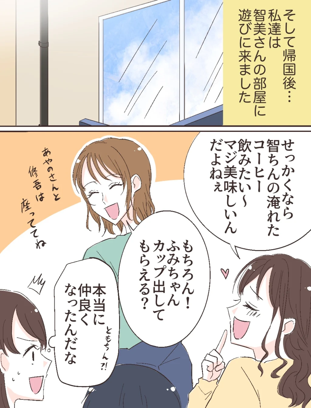 そして帰国後・・。私たちは智美さんの部屋に遊びに来ました。「せっかくなら智ちんの淹れたコーヒー飲みたい~。マジ美味しいんだよねぇ」と図々しくお願いするふみのに、嫌な顔ひとつせず「もちろん!ふみちゃん、カップ出してもらえる?」と笑顔で答える智美さんを見て驚きました。いつの間に「ともちん」「ふみちゃん」なんて呼び合う仲になったの?私の知らない間に本当に仲良くなったんだなぁ。