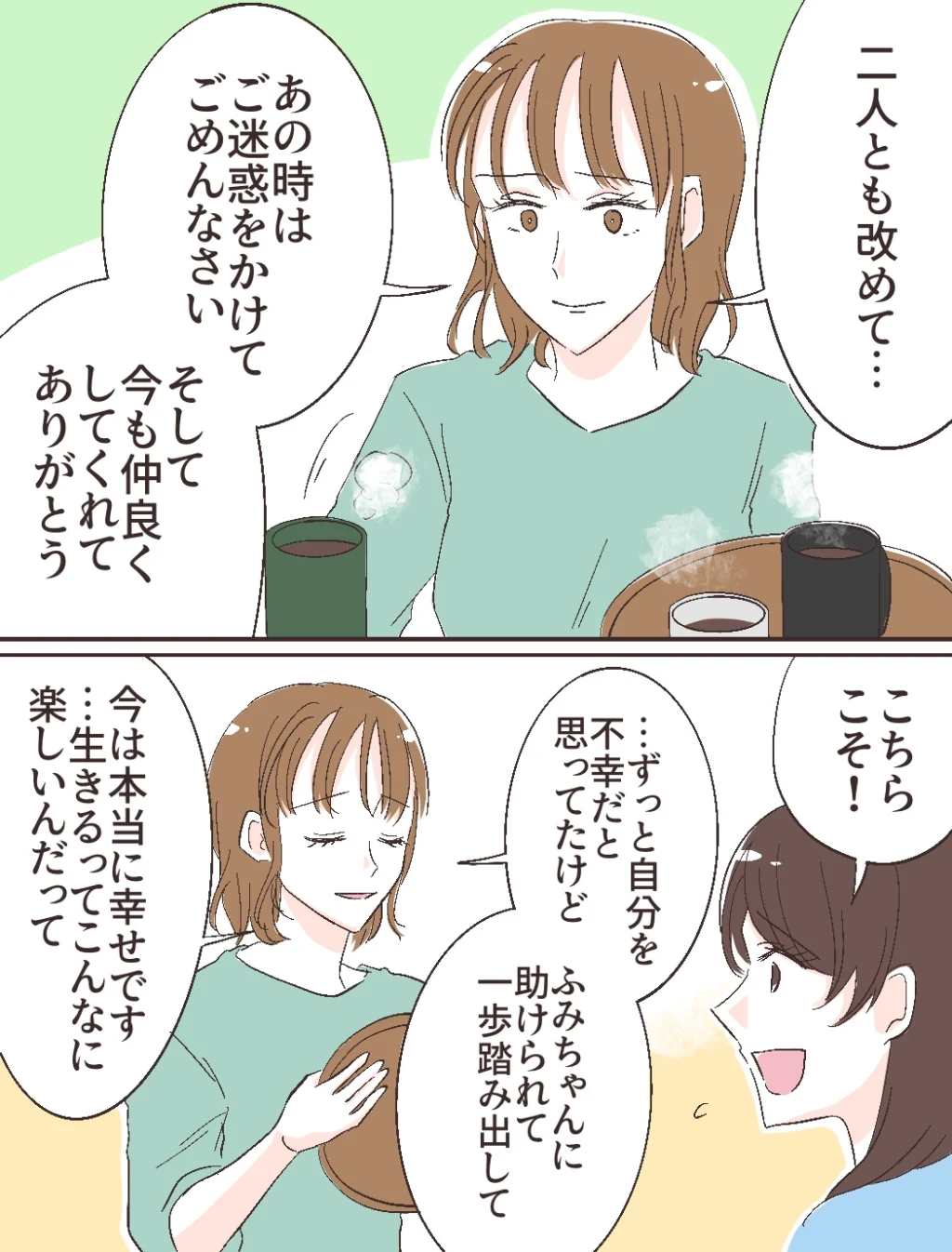 智美さんは丁寧に淹れてくれたコーヒーを差し出しながら「二人とも改めて・・あの時はご迷惑をかけてごめんなさい。そして、今も仲良くしてくれてありがとう」と静かに言いました。「こちらこそ!」と返すと、智美さんは「・・ずっと自分を不幸だと思ってたけど、ふみちゃんに助けられて一歩踏み出して、今は本当に幸せです。・・生きるってこんなに楽しいんだって」と噛み締めるように言いました。