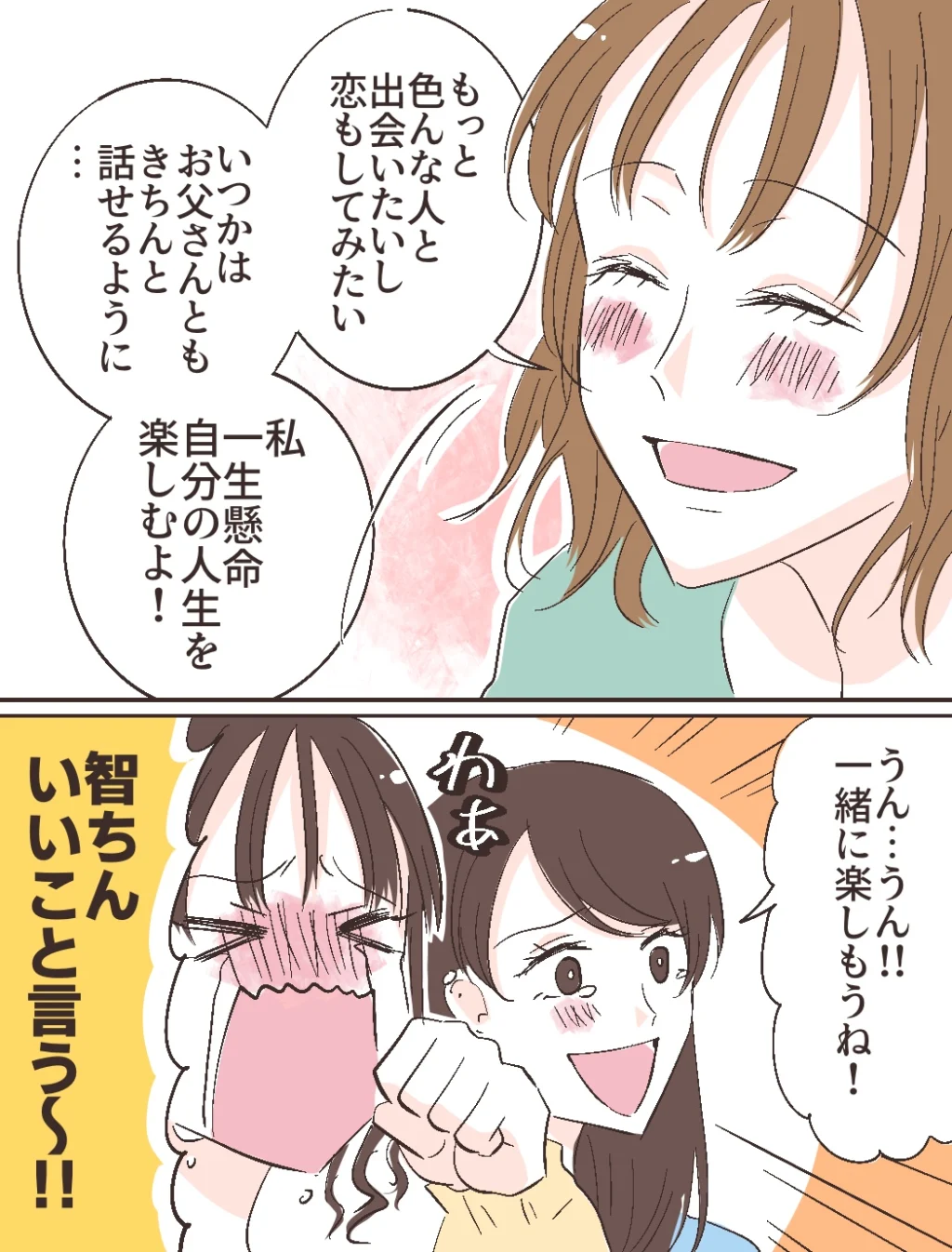 「もっと色んな人と出会いたいし、恋もしてみたい。いつかはお父さんともきちんと話せるように・・私、一生懸命自分の人生を楽しむよ!」そう言って笑った智美さんはキラキラ輝いて見えました。「うん・・うん!!一緒に楽しもうね!」思わず涙ぐむ私の隣では、ふみのが「智ちんいいこと言う~!!」と感極まって大号泣。